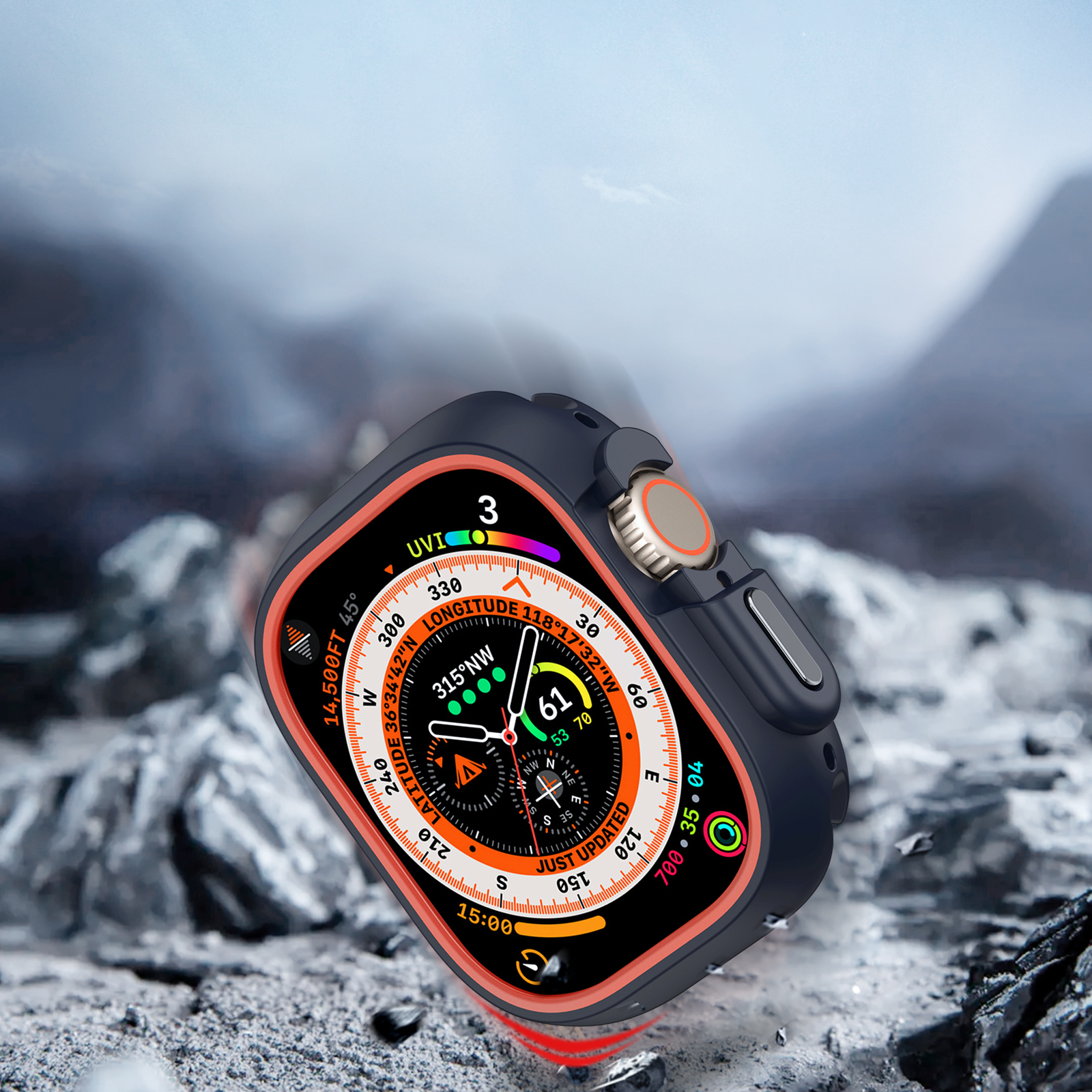 Оригинальный чехол темно-синий с оранжевыми вставками (Midnight/Orange) от Dux Ducis серии Bamo Series Case для смарт-часов Apple Watch Ultra 1 и 2 размер 49мм, представляет собой цельную конструкцию, которая обеспечивает полную защиту ваших часов от падений. Боковые рамки изготовлены из экологически чистого ПК и мягкого ТПУ, что предохраняет ваши часы от царапин и износа при использовании.