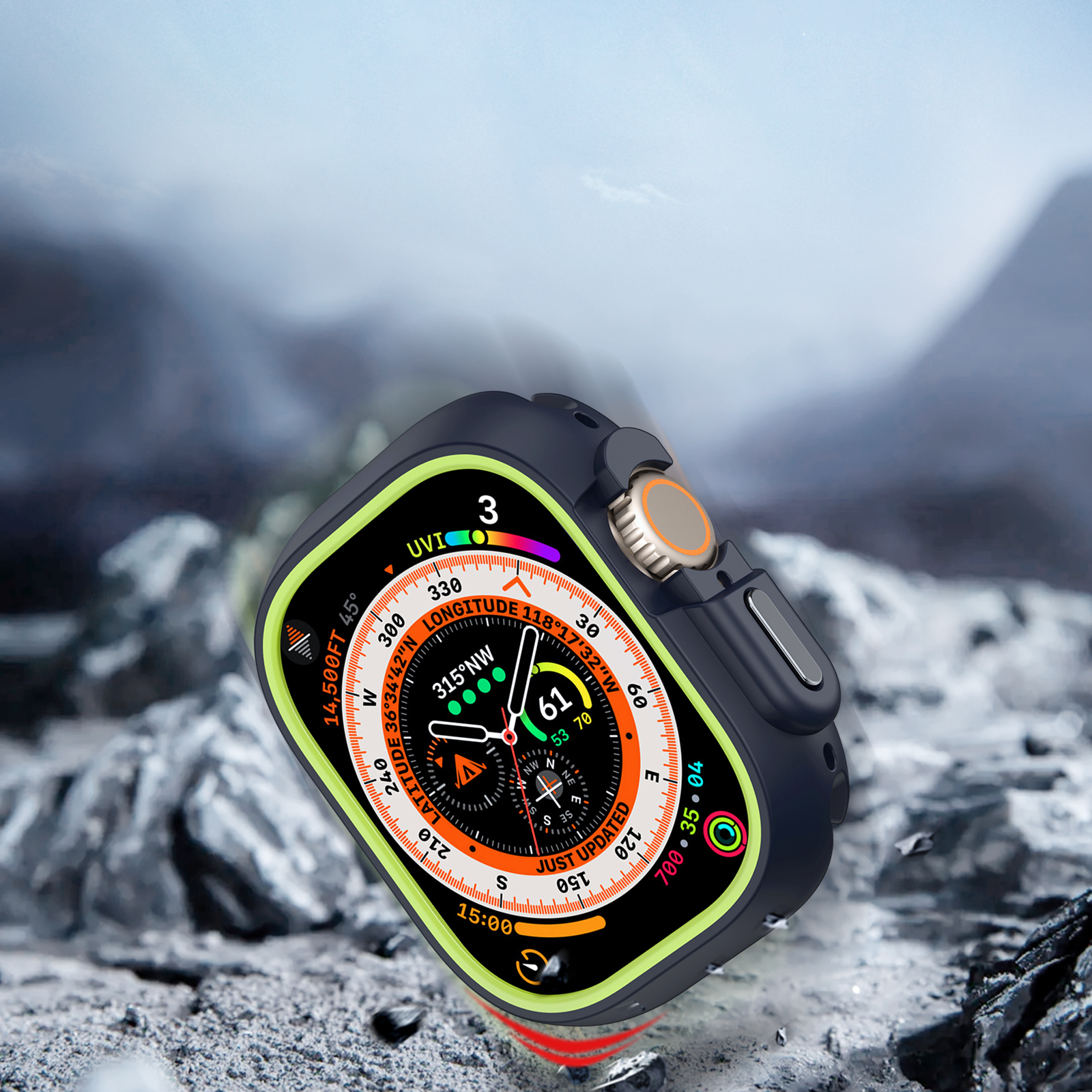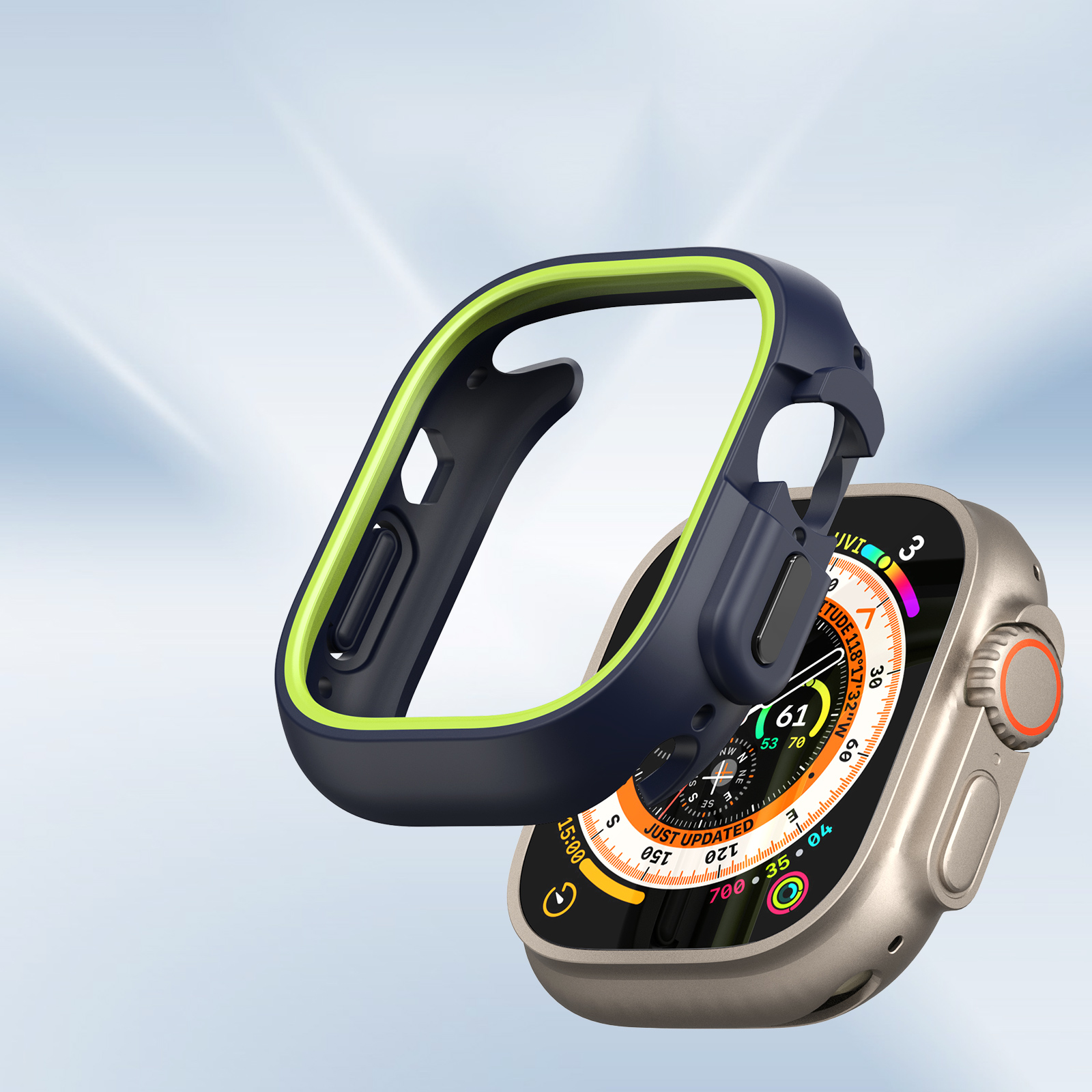 Оригинальный чехол темно-синий с зелеными вставками (Midnight/Green) от Dux Ducis серии Bamo Series Case для смарт-часов Apple Watch Ultra 1 и 2 размер 49мм, представляет собой цельную конструкцию, которая обеспечивает полную защиту ваших часов от падений. Боковые рамки изготовлены из экологически чистого ПК и мягкого ТПУ, что предохраняет ваши часы от царапин и износа при использовании.