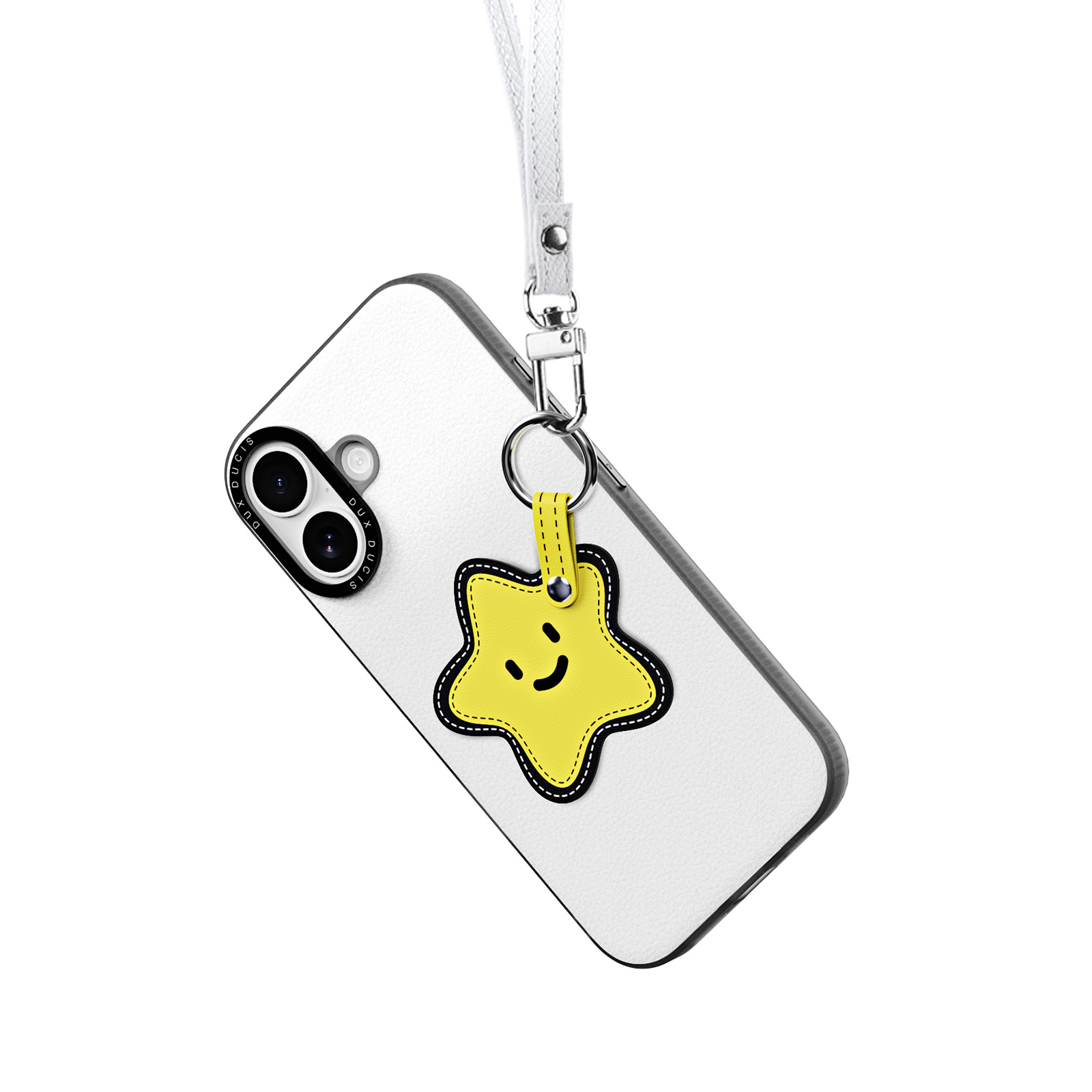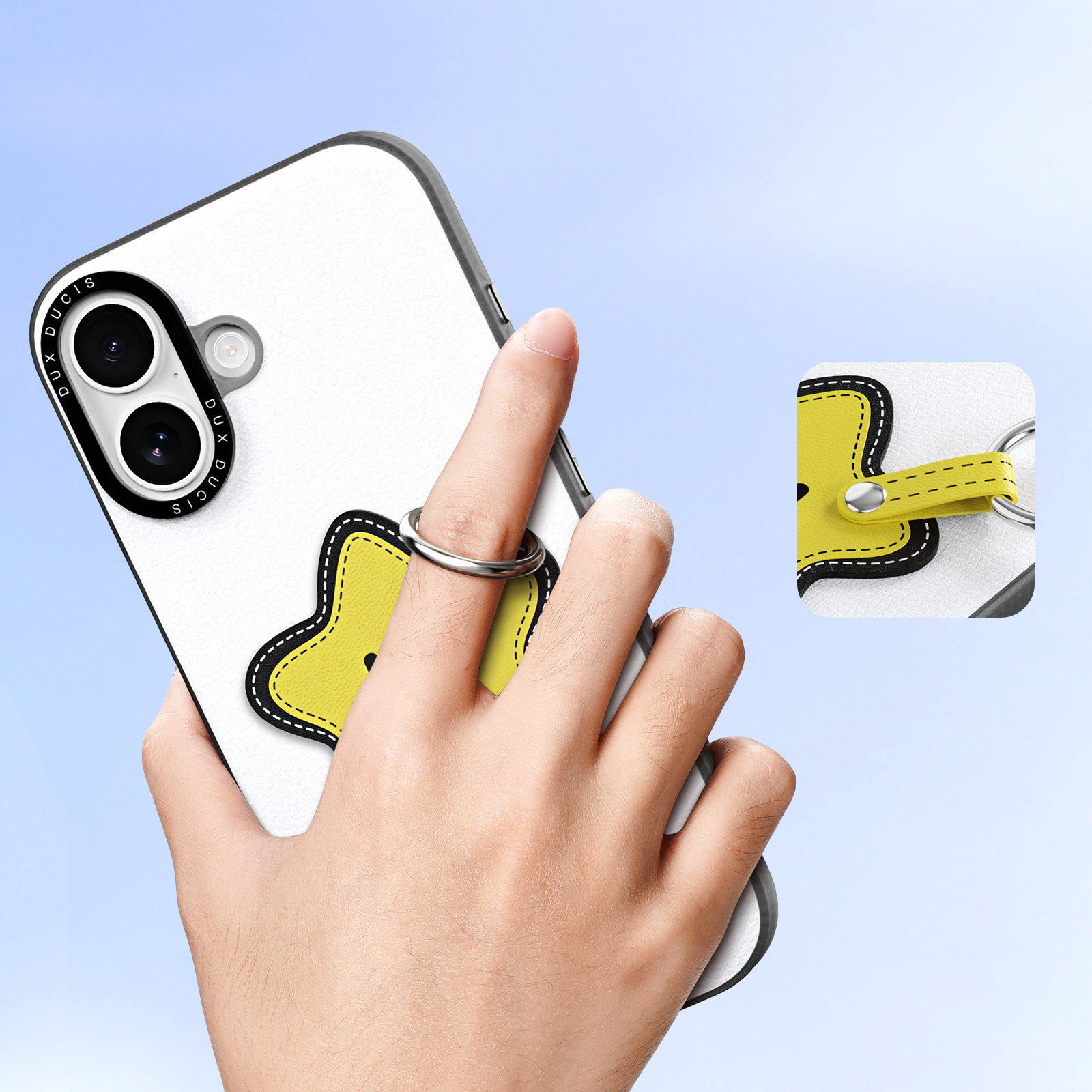 Чехол из искусственной кожи белого цвета (Star Edition) серии Luvy для iPhone 17. Встроенное вращающееся кольцо - надёжный захват одной рукой, предотвращающий падение; в комплект входит ремешок с защитой от потери.
