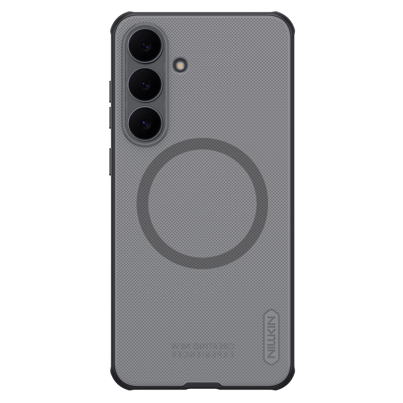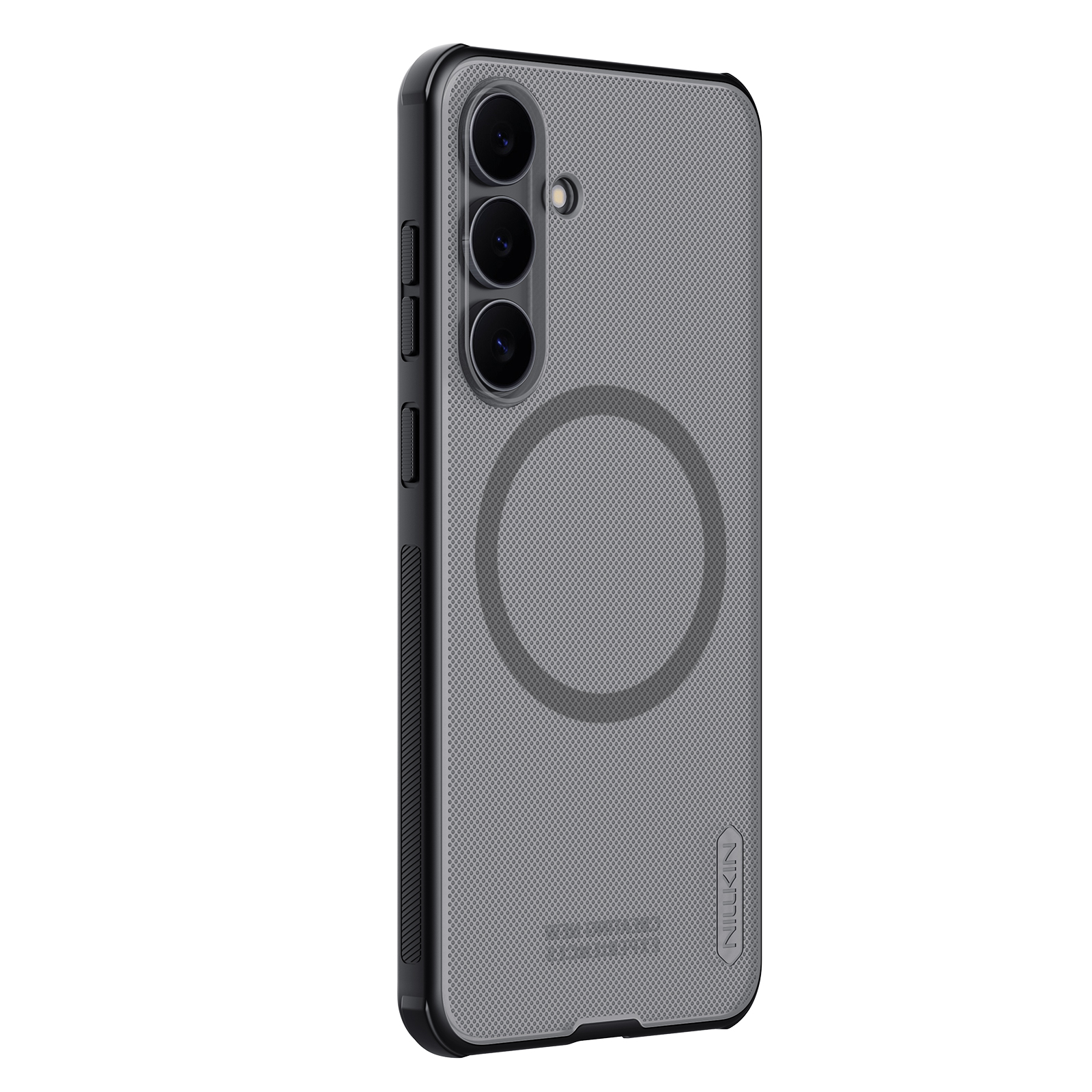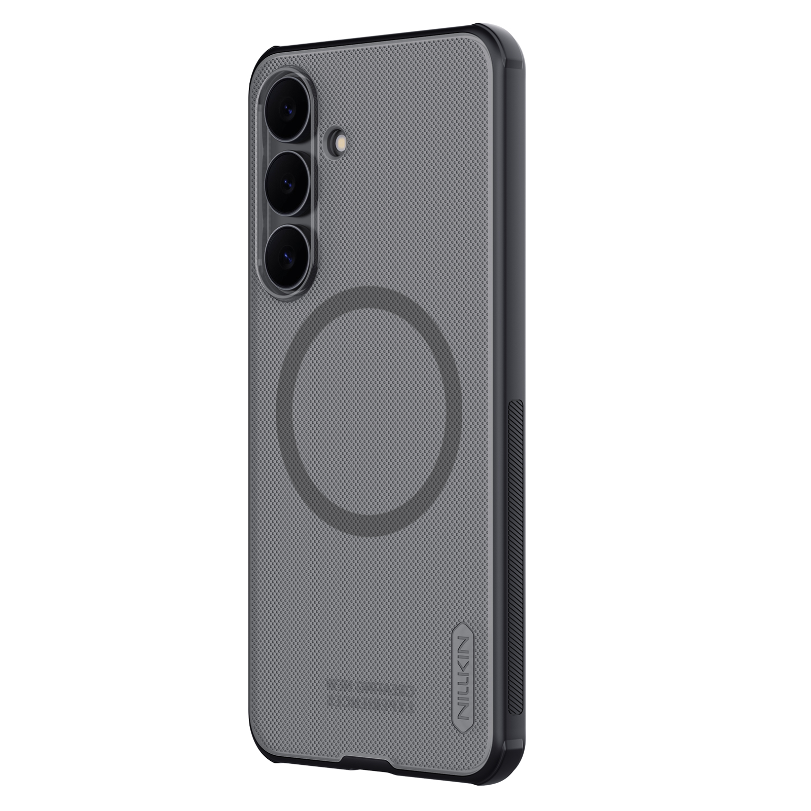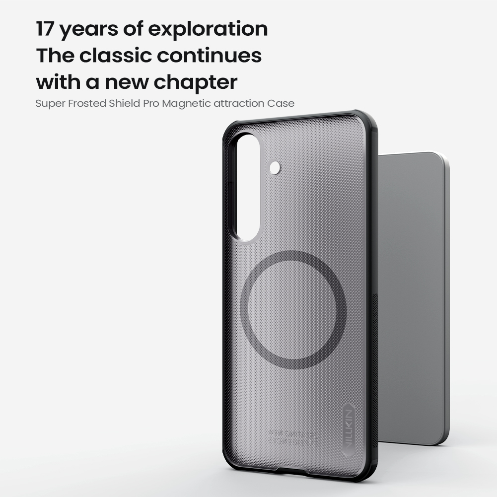 Защитный чехол прозрачный тонированный (Transparent black) от Nillkin серии Super Frosted Shield Pro Magnetic (Clear version) для смартфона Samsung Galaxy S25 FE с усиленными боковыми рамками по четырем углам и поддержкой зарядки MagSafe, изготавливается из экологичных материалов PC и TPU путем высокоточного литья под давление с высокой температурой.