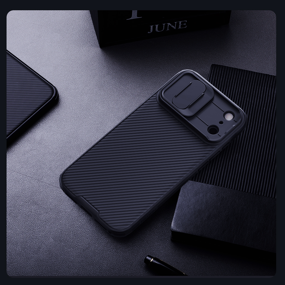 Обновлённая версия сдвижной шторки с учетом особенностей Айфон 17 Про Макс! Противоударный чехол черного цвета с защитной шторкой задней камеры от Nillkin серии CamShield Pro Magnetic Case (с поддержкой беспроводной зарядкой MagSafe) для телефона iPhone 17 Pro Max создан для любителей активного отдыха.