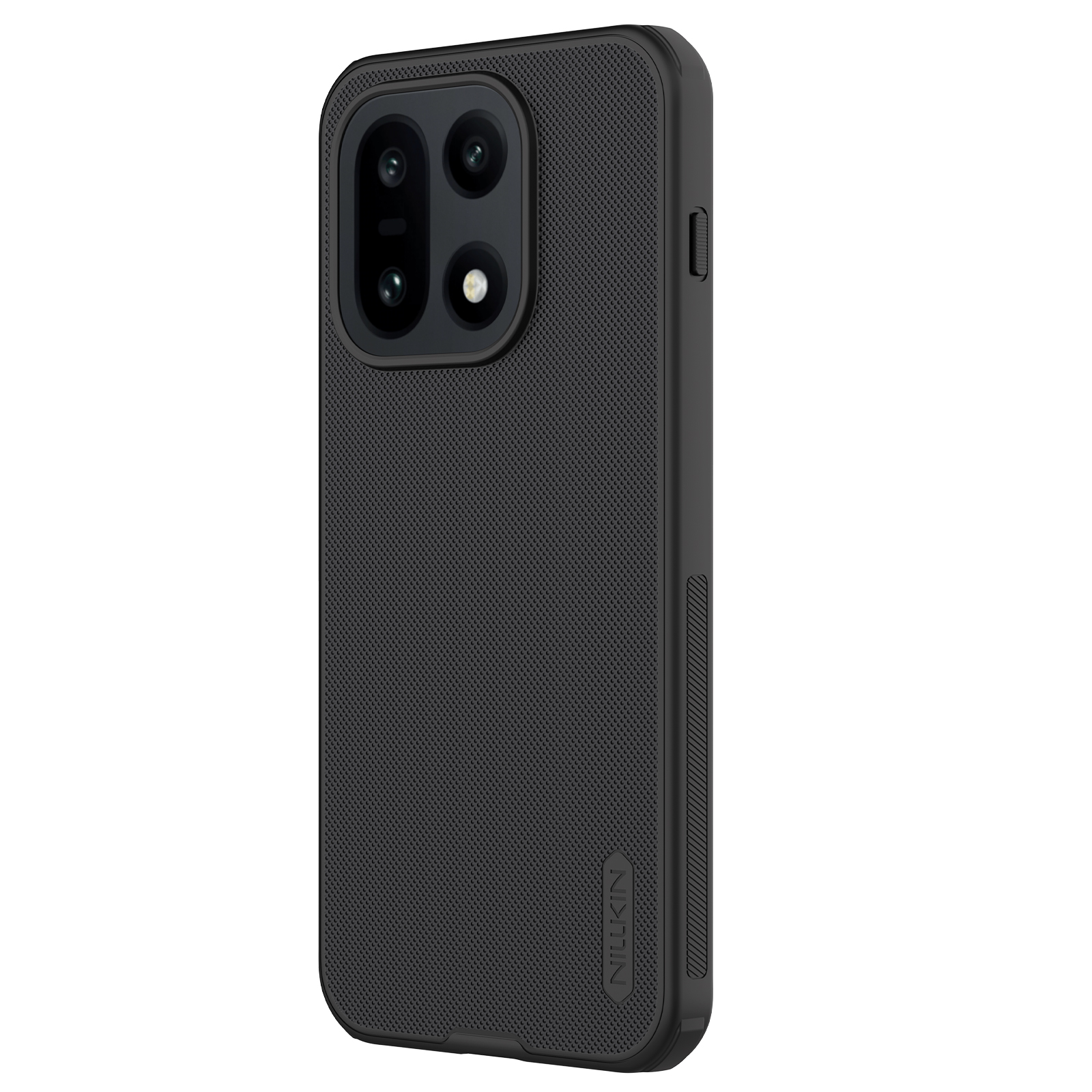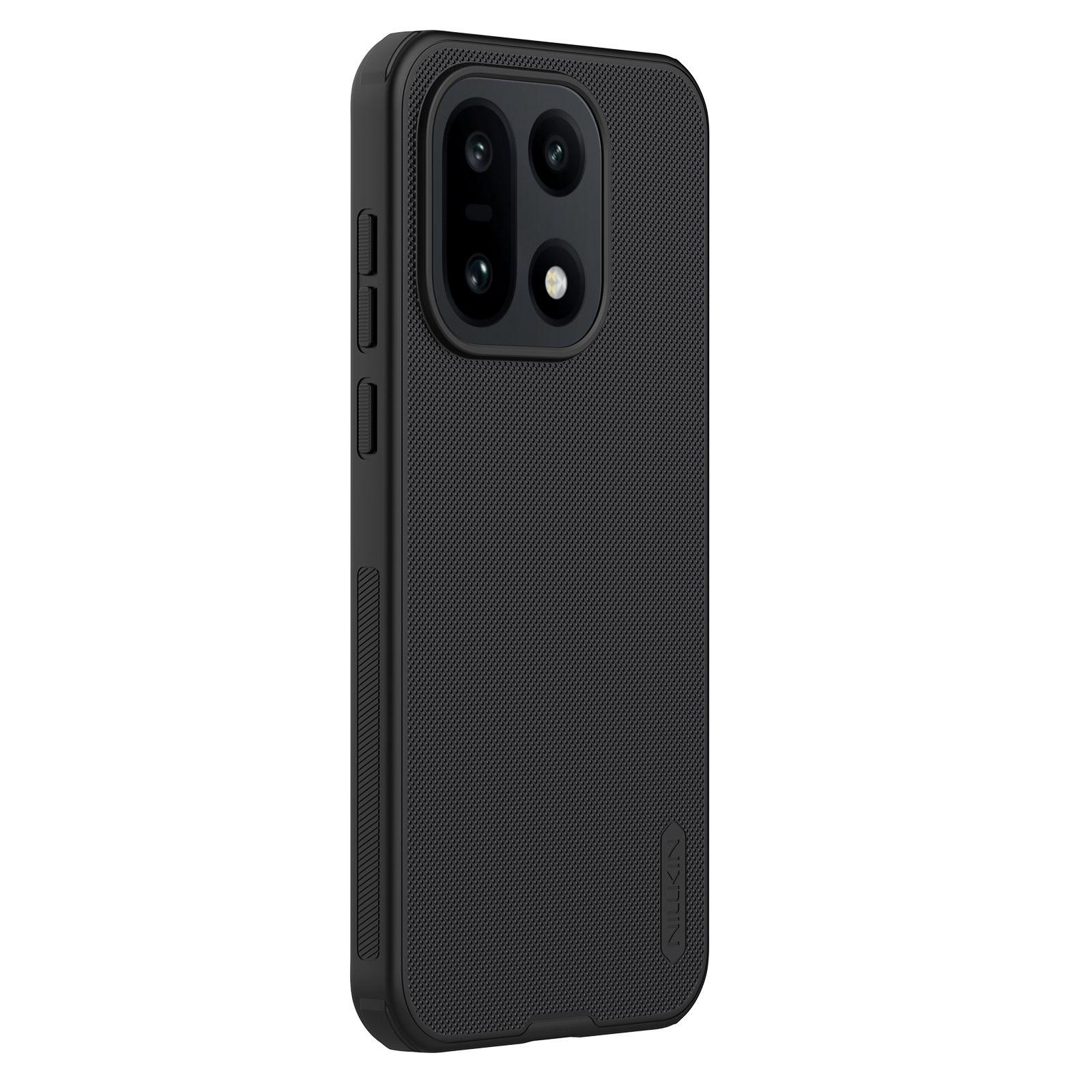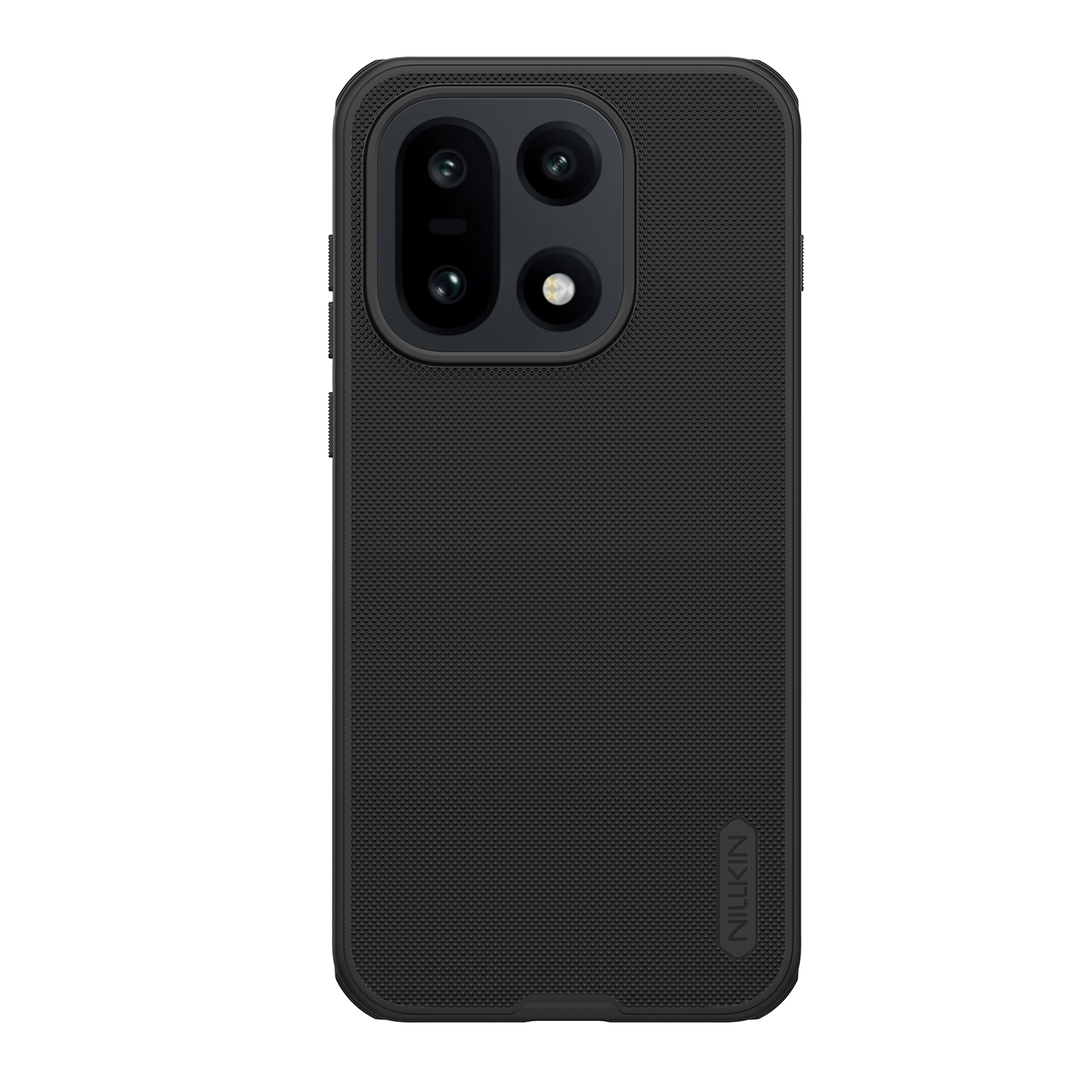 Чехол черного цвета от Nillkin серии Super Frosted Shield Pro Magnetic для смартфона OnePlus 15 с усиленными боковыми рамками по четырем углам и поддержкой зарядки MagSafe, изготавливается из экологичных материалов PC и TPU путем высокоточного литья под давление с высокой температурой.