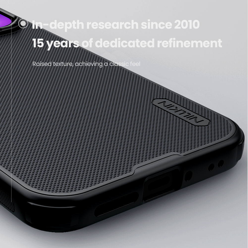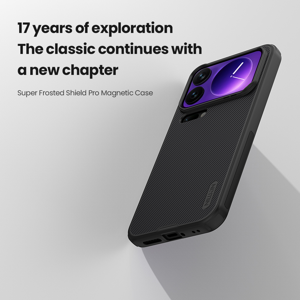 Чехол черного цвета от Nillkin серии Super Frosted Shield Pro Magnetic для смартфона Xiaomi 17 Pro Max с усиленными боковыми рамками по четырем углам и поддержкой зарядки MagSafe, изготавливается из экологичных материалов PC и TPU путем высокоточного литья под давление с высокой температурой.