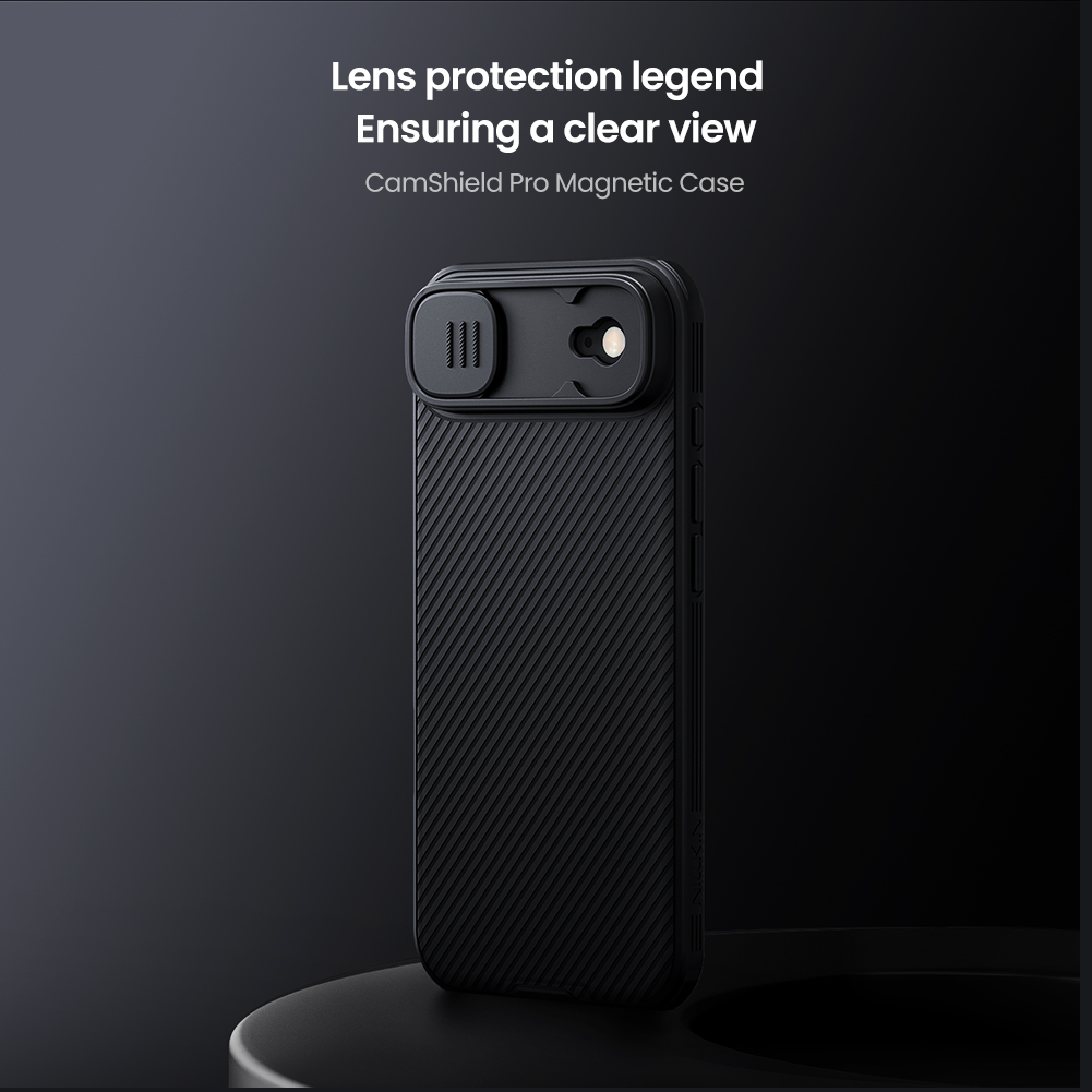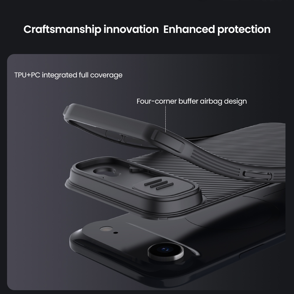 Противоударный чехол черного цвета с защитной шторкой задней камеры от Nillkin серии CamShield Pro Magnetic Case (с поддержкой беспроводной зарядкой MagSafe) для телефона iPhone Air создан для любителей активного отдыха.