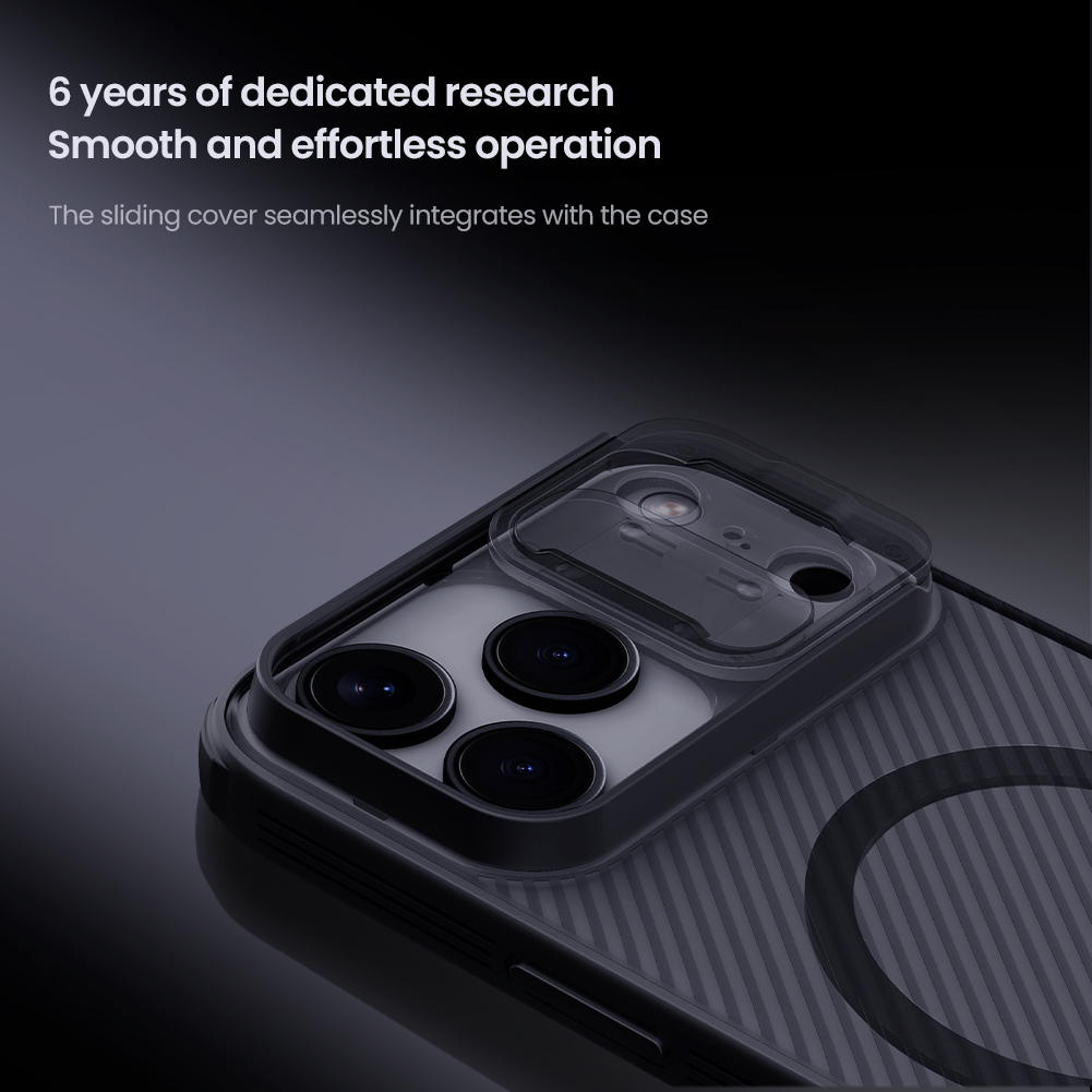 Обновлённая версия сдвижной шторки с учетом особенностей Айфон 17 Про Макс! Противоударный чехол прозрачный тонированный (Transparent black) с защитной шторкой задней камеры и беспроводной зарядкой MagSafe от Nillkin серии CamShield Pro Magnetic Case для телефона iPhone 17 Pro Max создан для любителей активного отдыха.