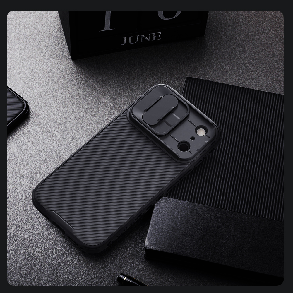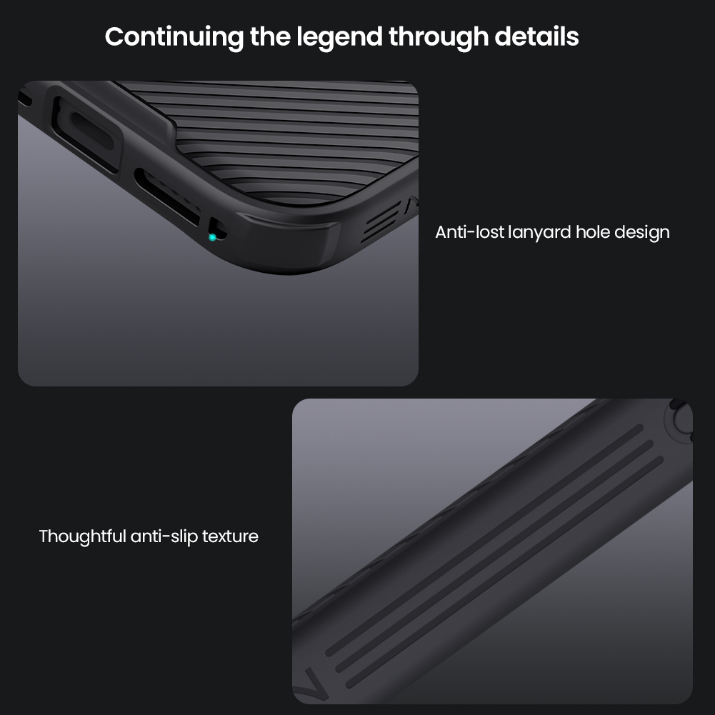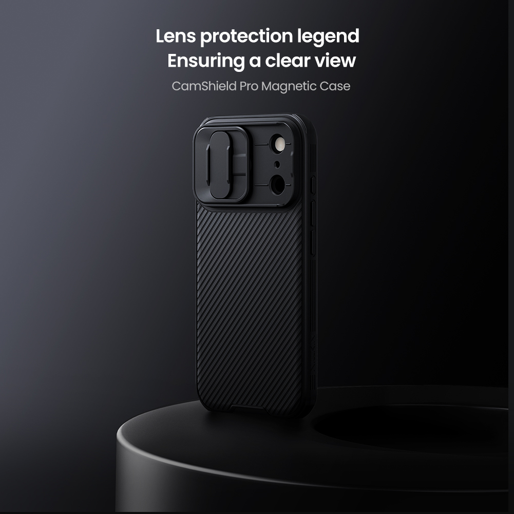 Обновлённая версия сдвижной шторки с учетом особенностей Айфон 17 Про! Противоударный чехол черного цвета с защитной шторкой задней камеры от Nillkin серии CamShield Pro Magnetic Case (с поддержкой беспроводной зарядкой MagSafe) для телефона iPhone 17 Pro создан для любителей активного отдыха.