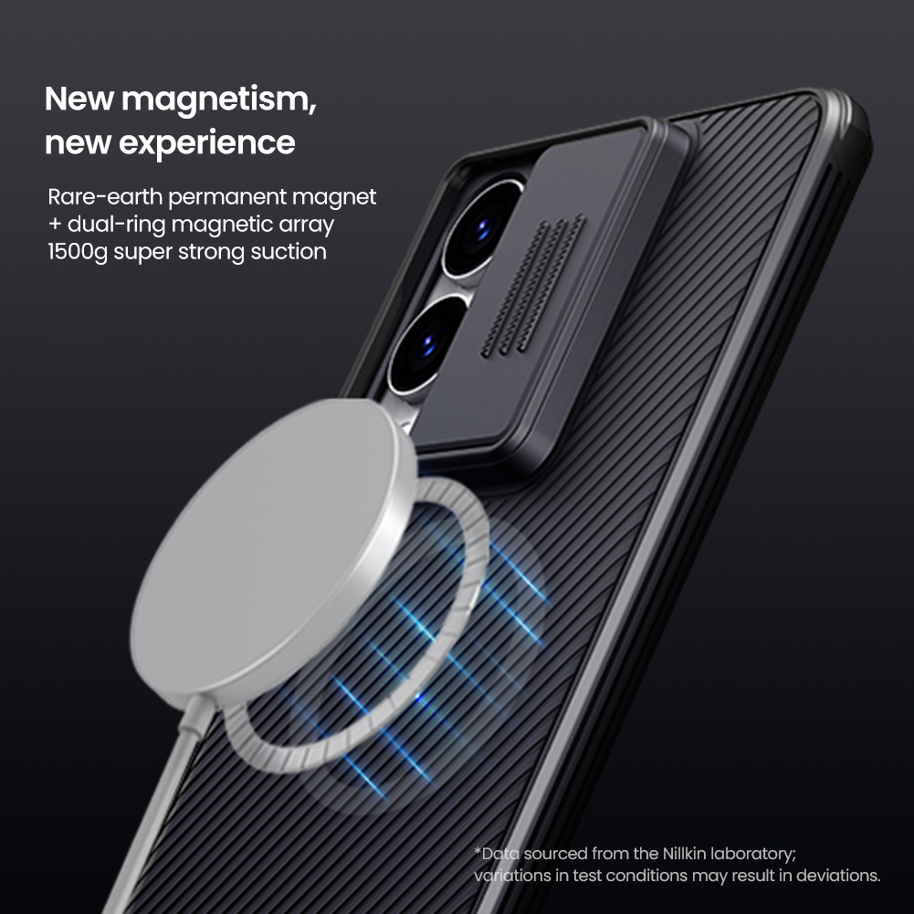Противоударный чехол с защитной крышкой для задней камеры и беспроводной зарядкой MagSafe от Nillkin серии CamShield Pro Magnetic Case для смартфона Samsung Galaxy S25 Edge.