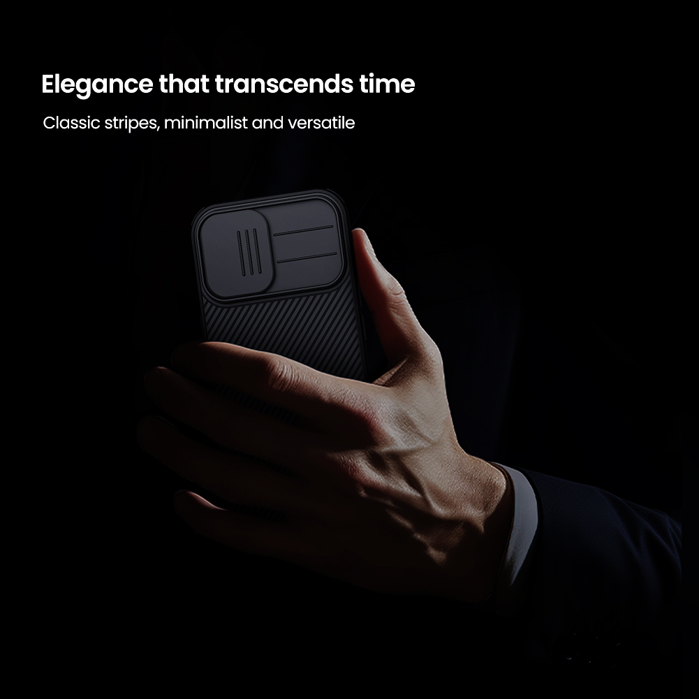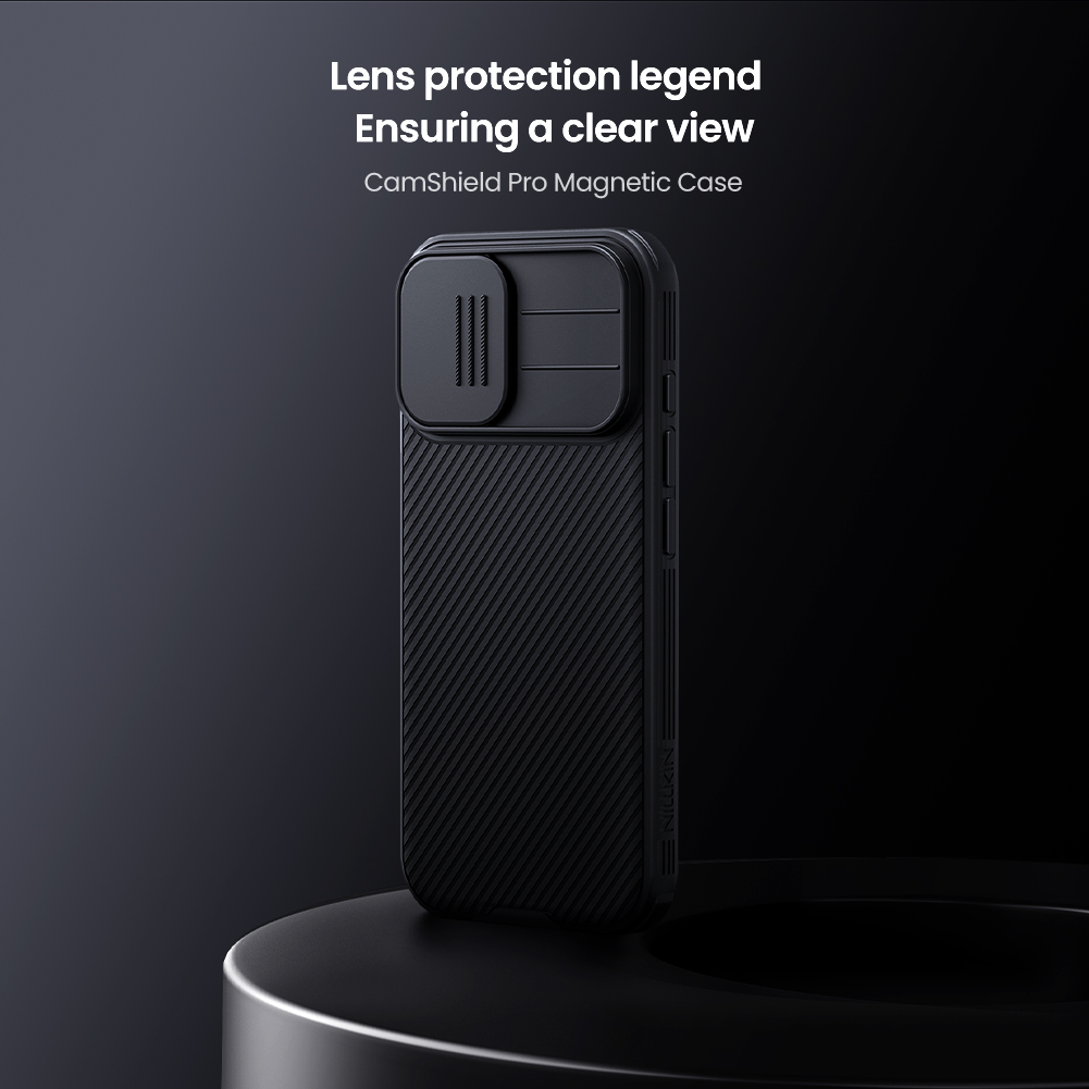 Противоударный чехол черного цвета с защитной шторкой задней камеры от Nillkin серии CamShield Pro Magnetic Case (с поддержкой беспроводной зарядкой MagSafe) для телефона iPhone 17 создан для любителей активного отдыха.