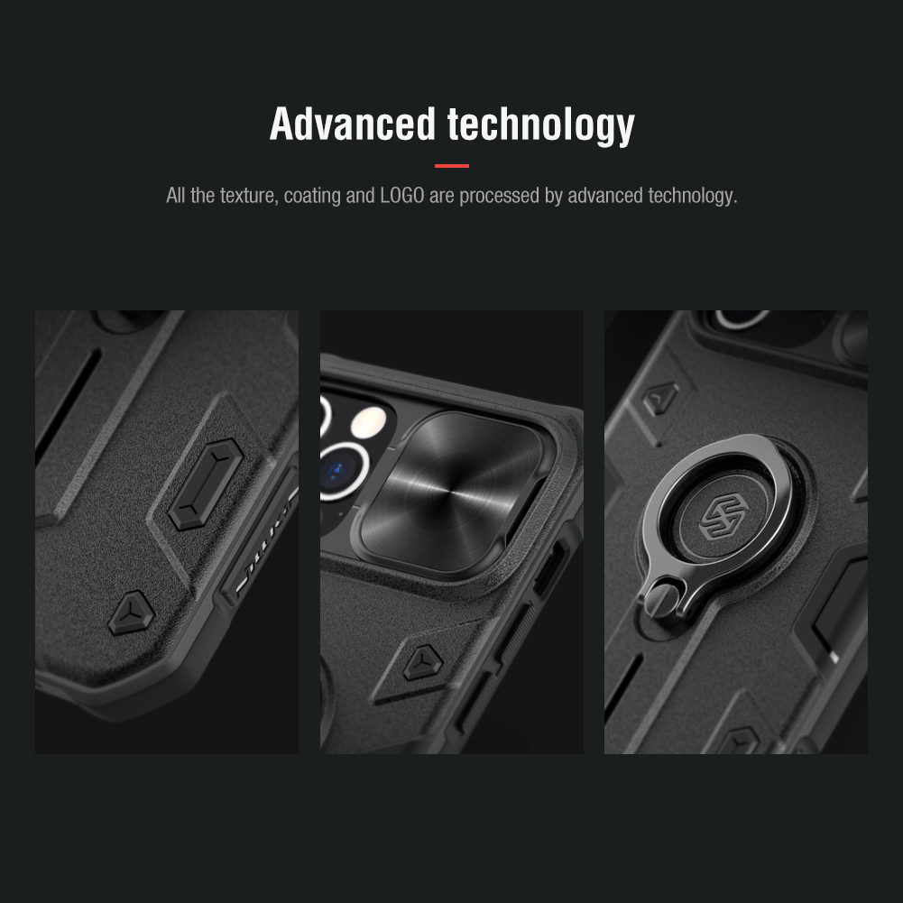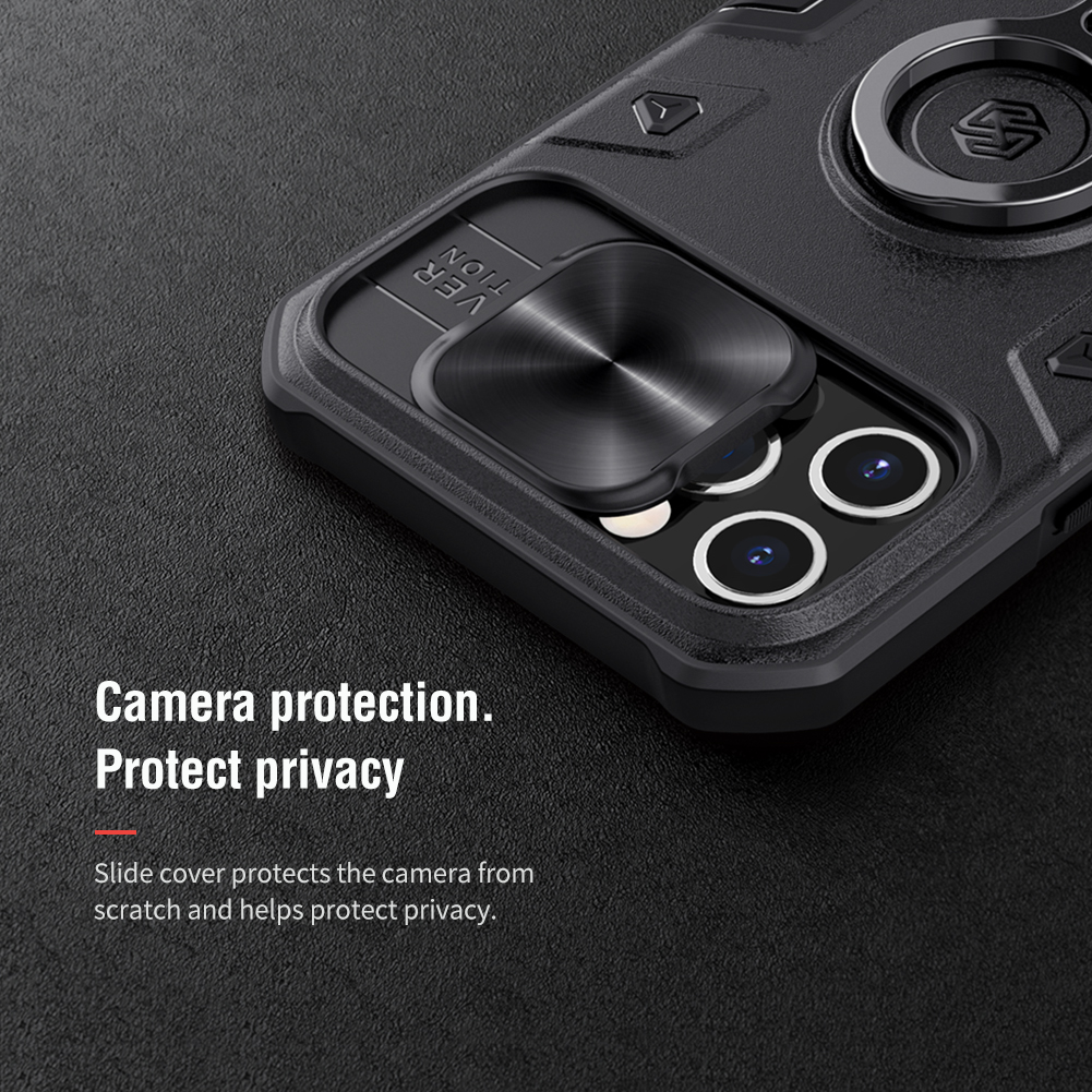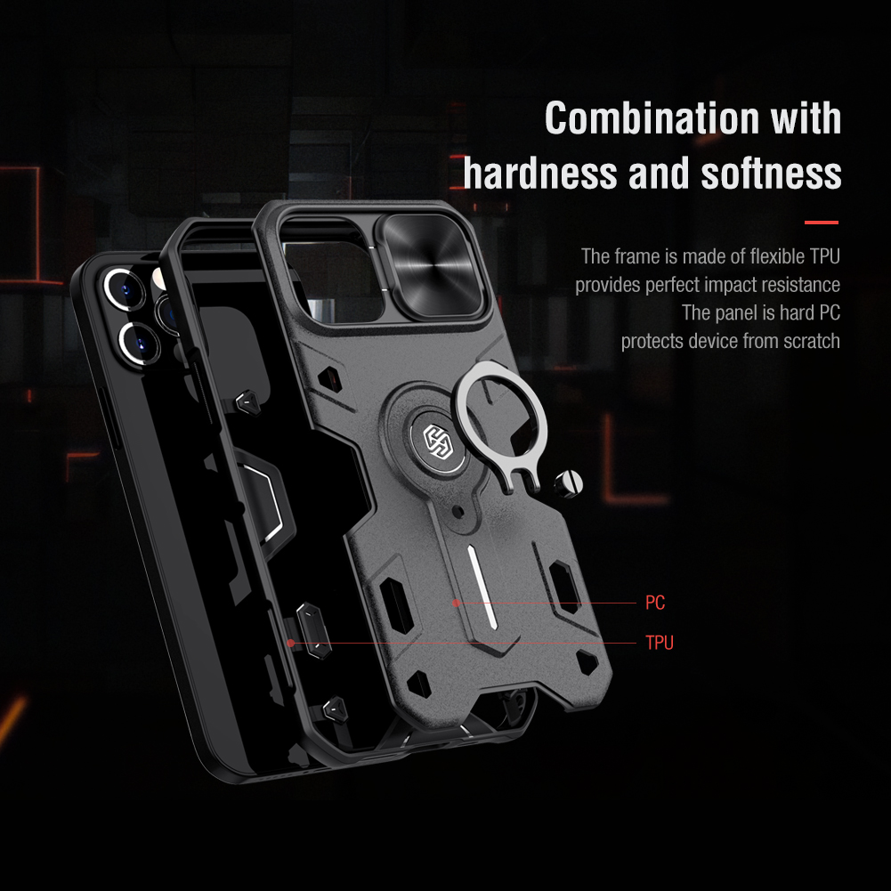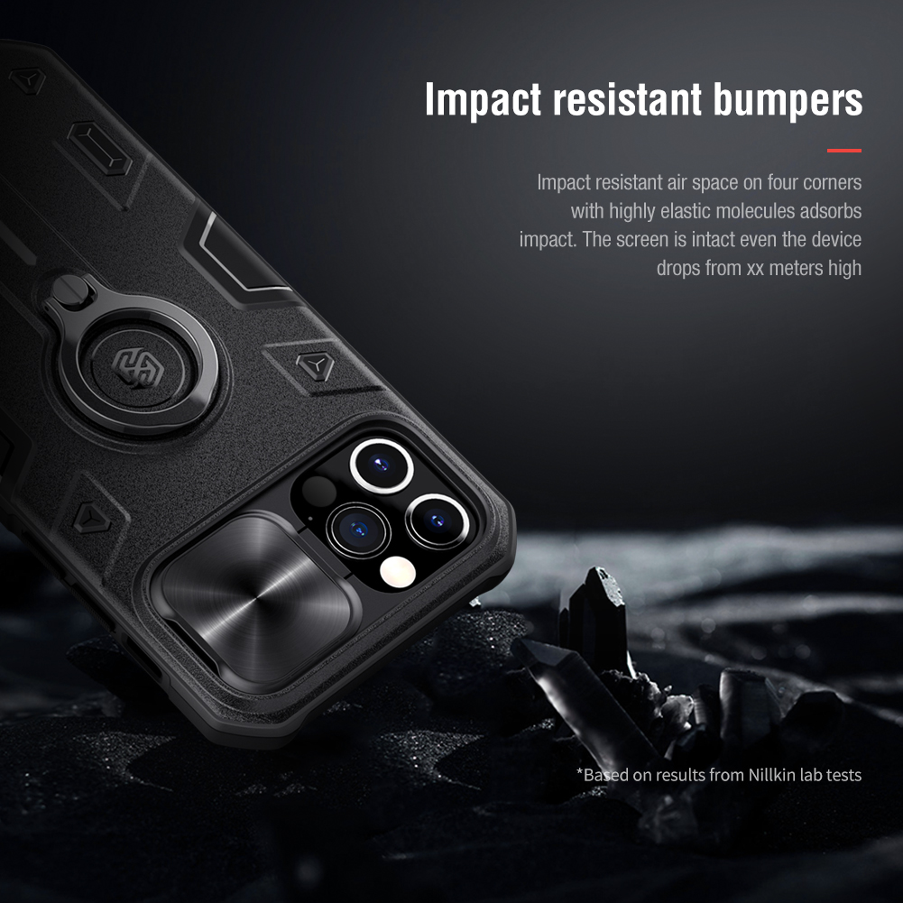 Противоударный чехол с кольцом и металлической защитной крышкой для задней камеры от Nillkin серии CamShield Armor Case для iPhone 12 и 12 pro создан для любителей активного отдыха.