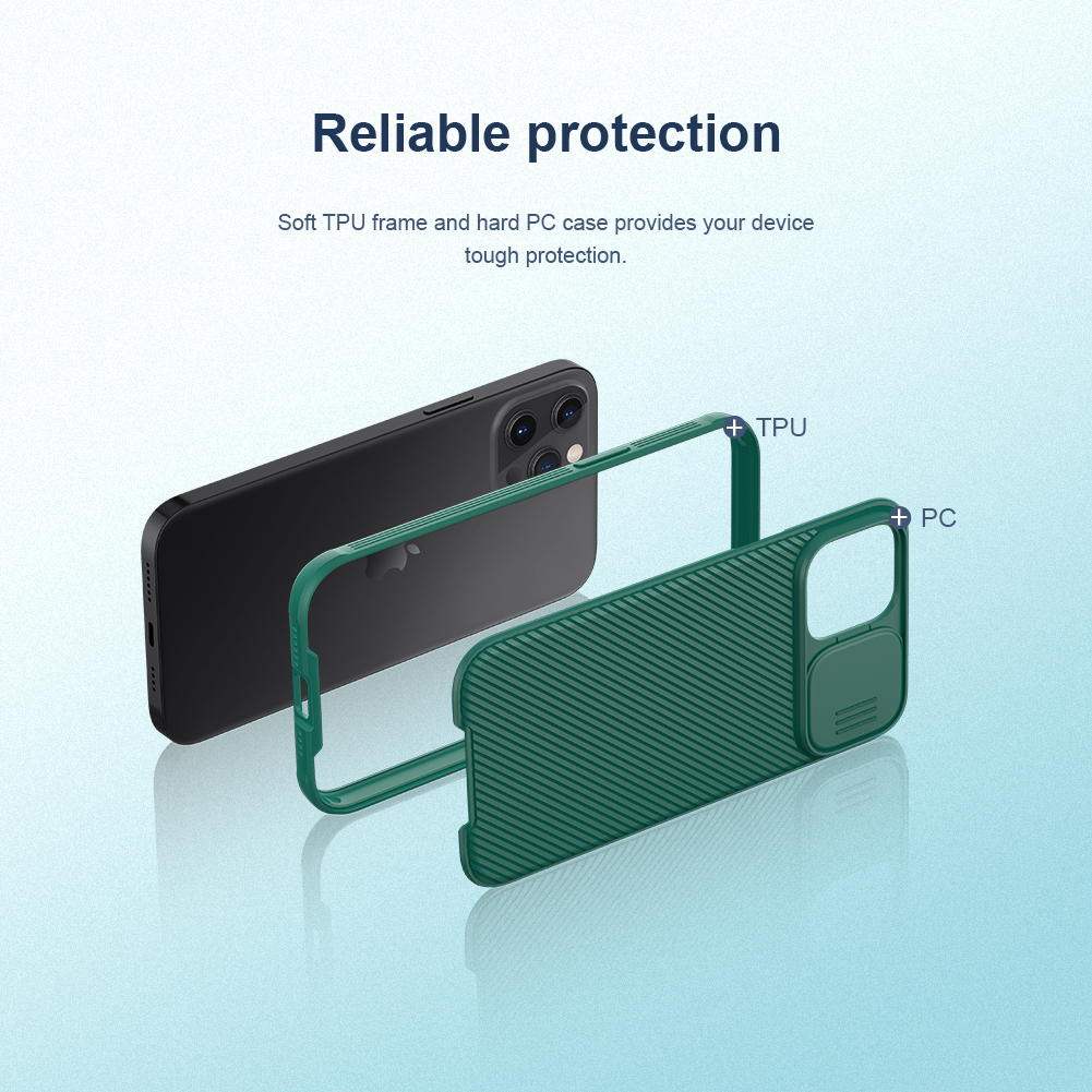 Противоударный чехол зеленого цвета с защитной крышкой задней камеры от Nillkin серии CamShield Pro Case для телефона iPhone 12 Pro Max создан для любителей активного отдыха.