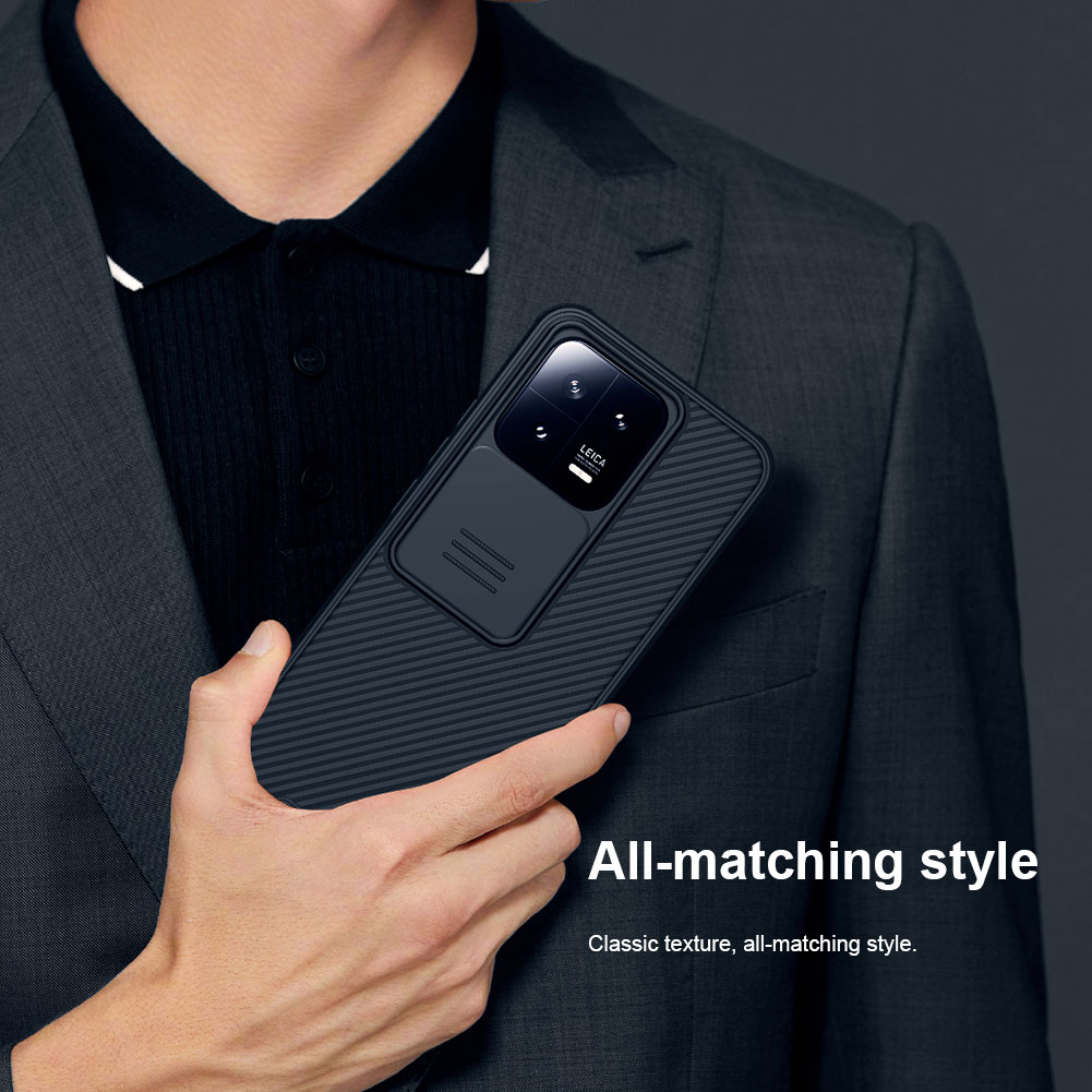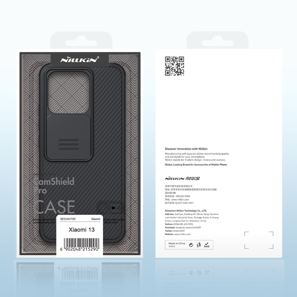 Противоударный чехол черного цвета с защитной шторкой задней камеры от Nillkin серии CamShield Pro Case для телефона Xiaomi 13 создан для любителей активного отдыха.
