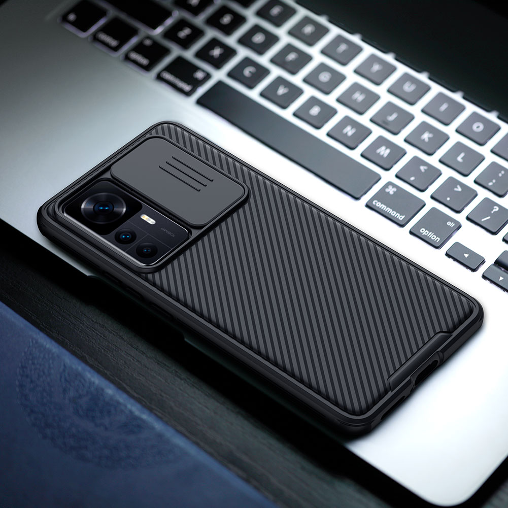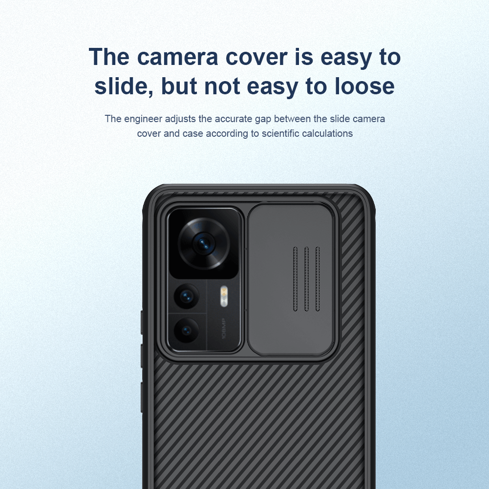 Противоударный чехол черного цвета с защитной шторкой задней камеры от Nillkin серии CamShield Pro Case для телефона Xiaomi 12T создан для любителей активного отдыха.