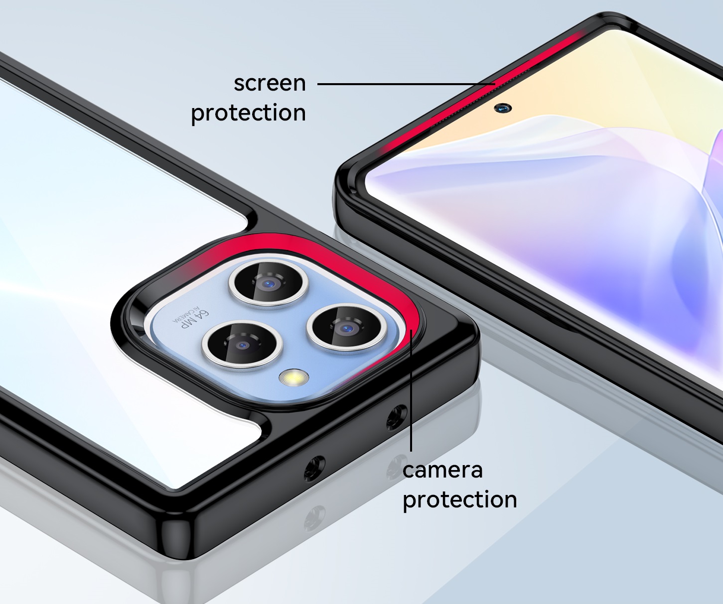 Специальные бортики на чехле приподнимают смартфон, не давая соприкасаться экрану и камере с плоскими поверхностями.