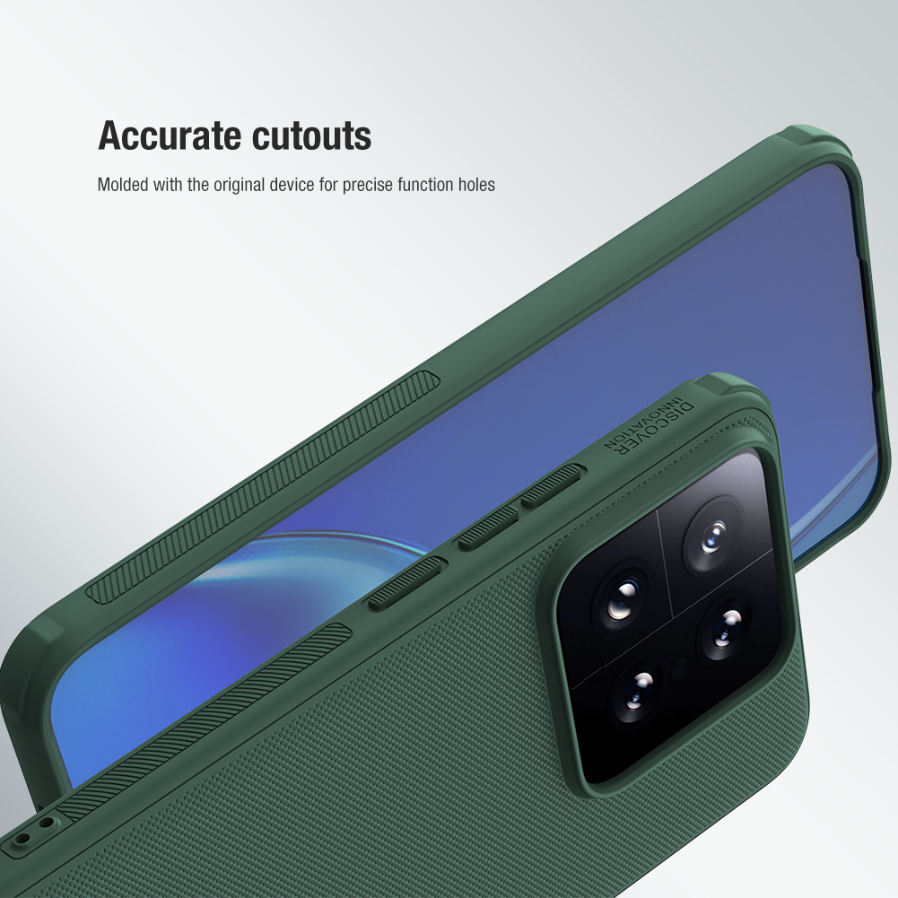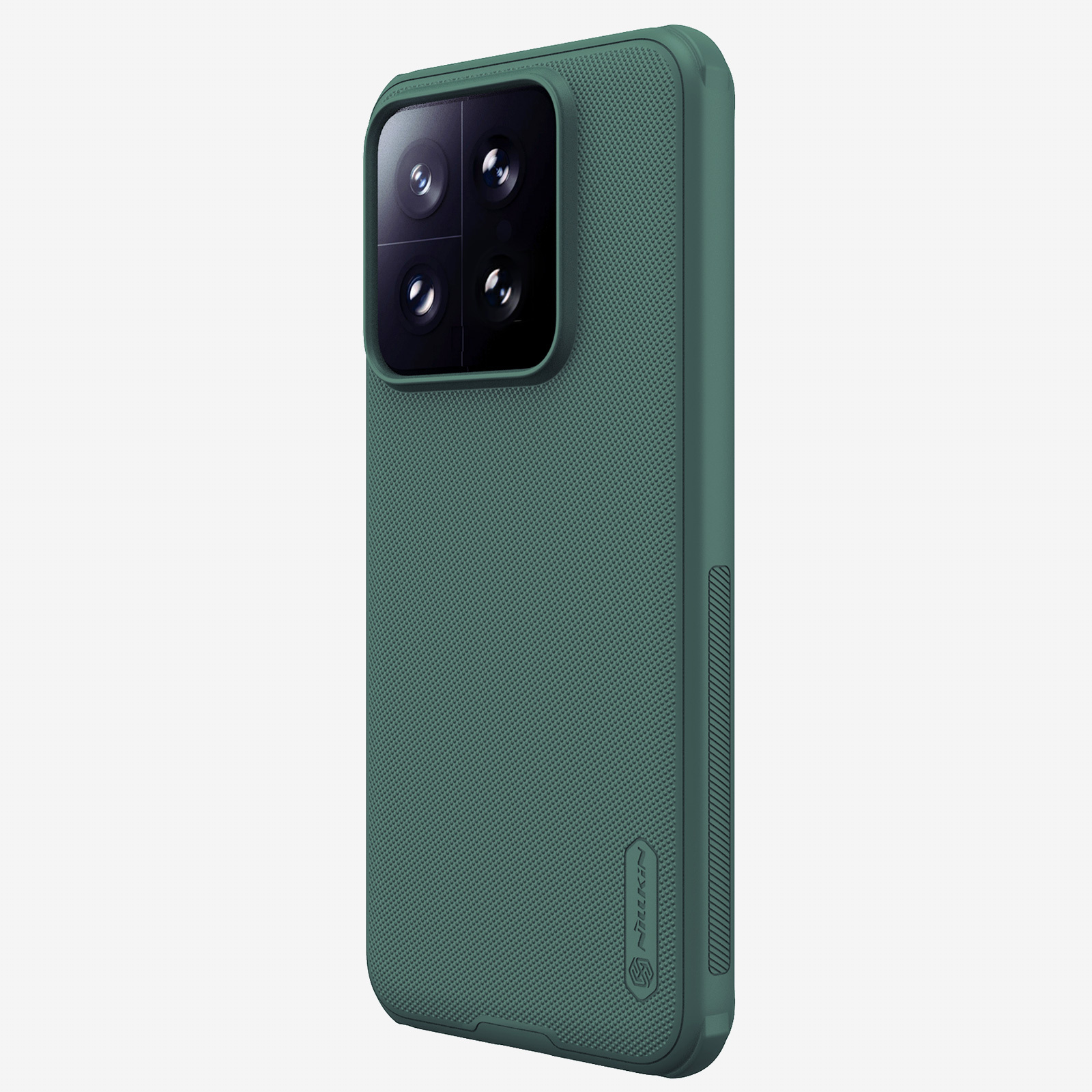 Защитный чехол зеленого цвета (Deep Green) от Nillkin серии Super Frosted Shield Pro для смартфона Xiaomi 14 с усиленными боковыми рамками по четырем углам, изготавливается из экологичных материалов PC и TPU путем высокоточного литья под давление с высокой температурой.