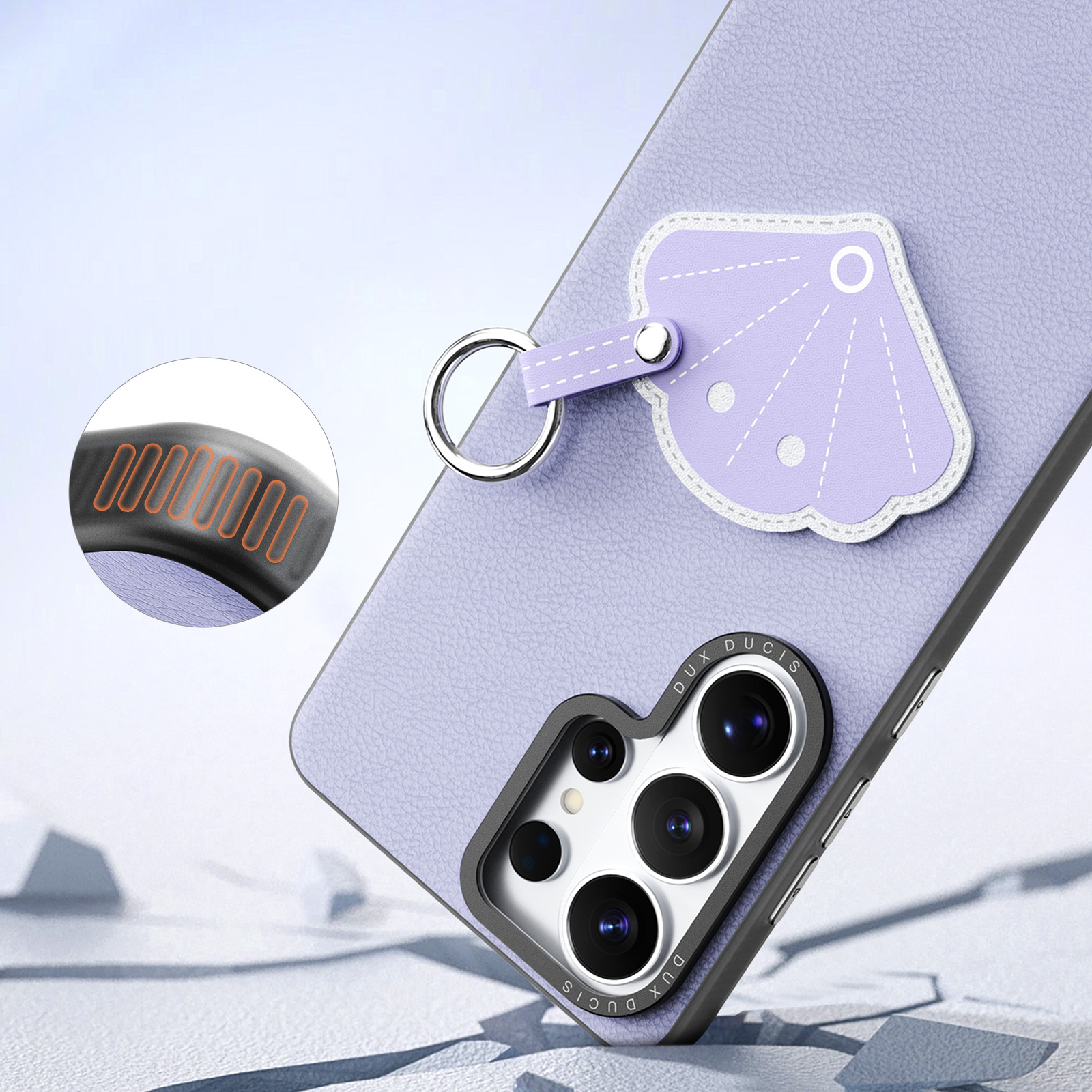 Фиолетовый чехол для смартфона Samsung Galaxy S26 Ultra, серия Luvy Series Case от бренда Dux Ducis - изысканный аксессуар глубокого лавандово-фиолетового оттенка, воплощающий сочетание утонченности и практичности. Матовая поверхность чехла приятно ощущается в руках и надёжно защищает заднюю панель устройства от возможных повреждений и следов износа. Центральным украшением служит оригинальный декоративный элемент в форме сердца с рисунком складчатого веера, выполненным контрастной строчкой, что придает дизайну особый шарм и индивидуальность. Удобный съёмный ремешок позволяет носить смартфон на запястье или прикрепить его к сумке, обеспечивая дополнительный комфорт и безопасность в повседневной жизни. Чехол точно повторяет контуры устройства, оставляя открытыми камеру и функциональные элементы, не мешая полноценному использованию смартфона. Такой аксессуар станет идеальным выбором для поклонников элегантных решений и ярких деталей.