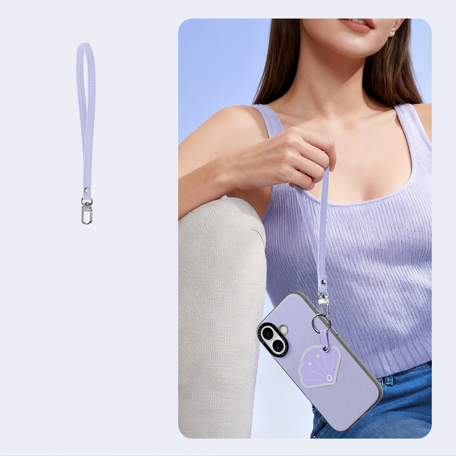 Чехол из искусственной кожи сиренево-фиолетового цвета (Shell Edition) серии Luvy для iPhone 17. Встроенное вращающееся кольцо - надёжный захват одной рукой, предотвращающий падение; в комплект входит ремешок с защитой от потери.