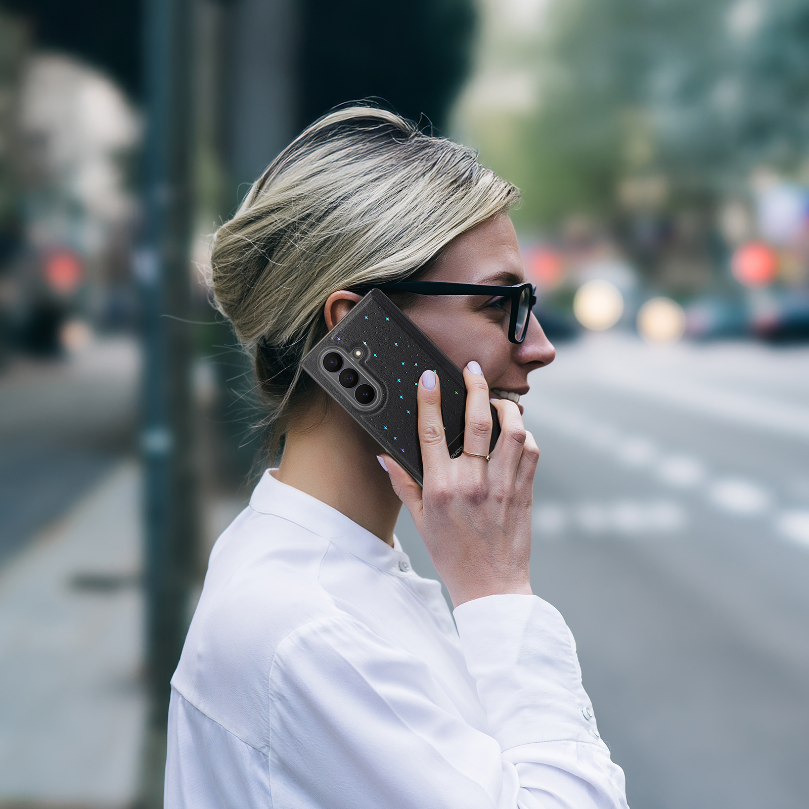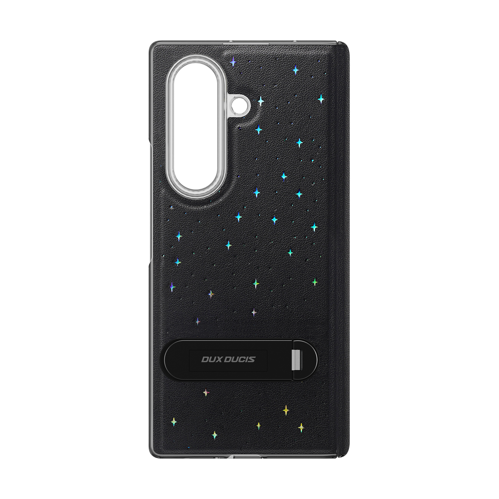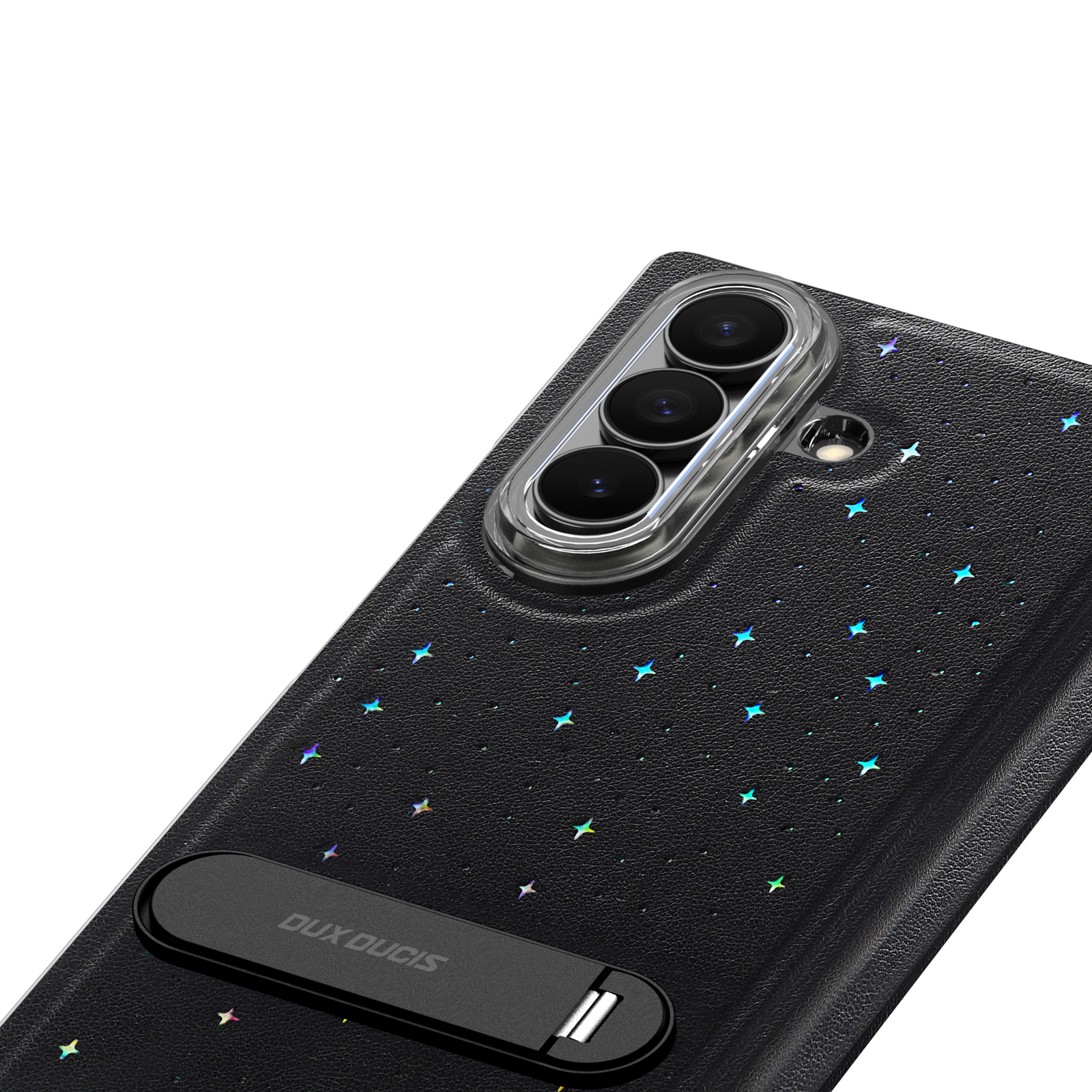 Чехол из искусственной кожи от Dux Ducis серии Stex Series Case (версия с вращающейся на 360 градусов подставкой) для смартфона Samsung Galaxy Z Fold 7 со светочувствительными мерцающими звездными и лазерными мотивами.