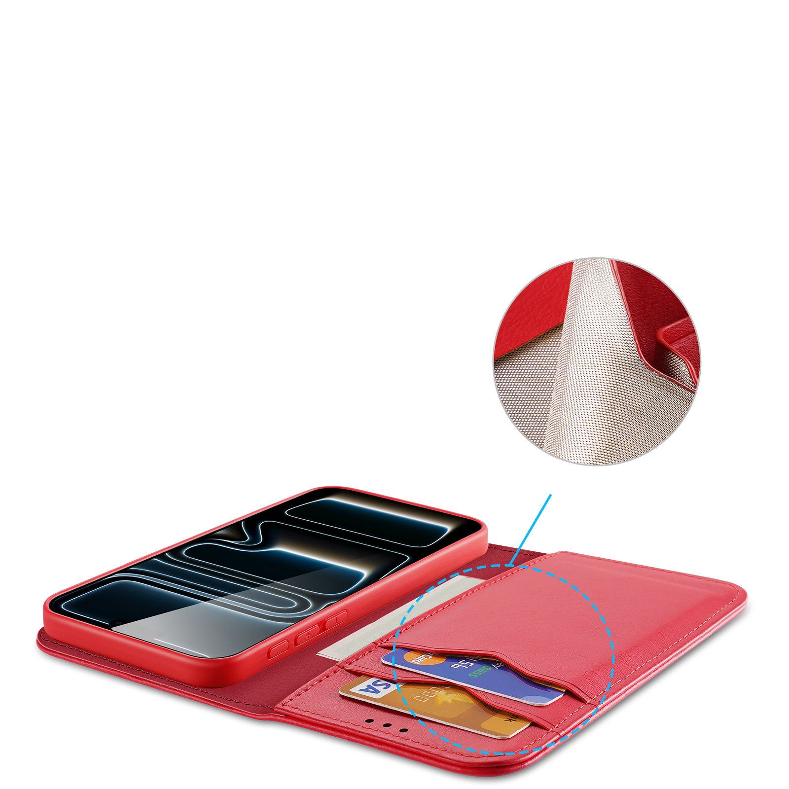 Чехол книжка из натуральной кожи красного цвета с защитой RFID от Dux Ducis для смартфона iPhone 17 Pro Max, серия Hivo Series Case. Чехол из натуральной кожи с материалом, блокирующим RFID, для защиты личной собственности и информации от кражи.