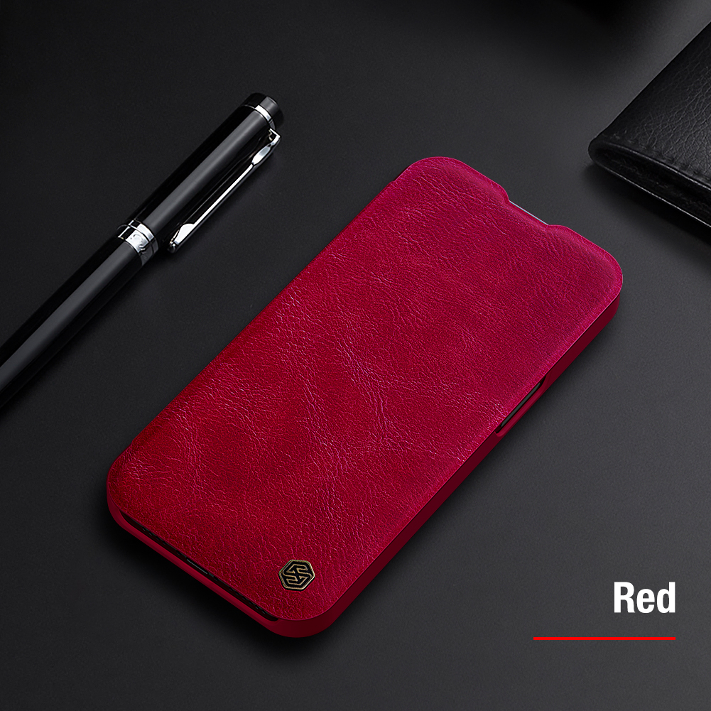 Ударопрочный, устойчивый к царапинам и нескользящий чехол книжка от Nillkin Qin Pro Leather красного цвета на телефон iPhone 13 Pro Max, с защитной шторкой для задней камеры