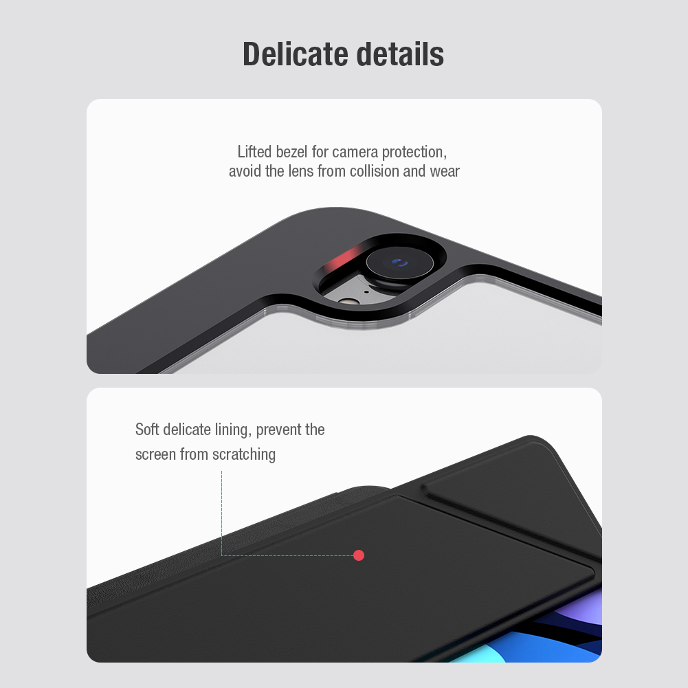 Откидная крышка изготовлена из текстурированной кожи PU, прочной и противоскользящей. Встроенное магнитное соединение поддерживает функцию автоматического пробуждения / сна iPad. Складывающийся угол для защиты линз iPad, складной треугольный кронштейн и держатель карандаша для полной защиты