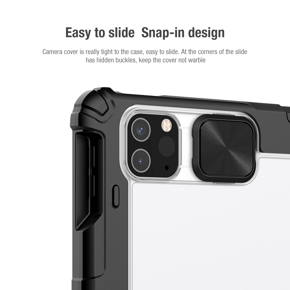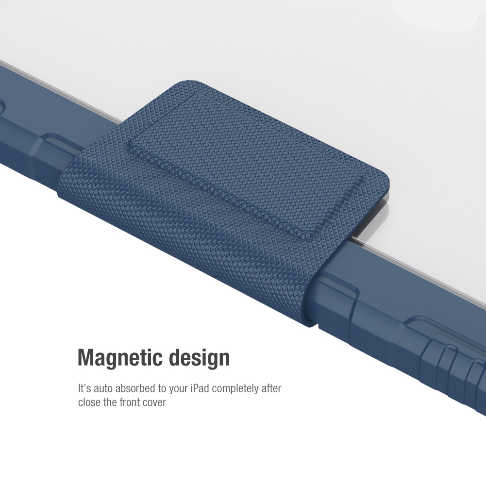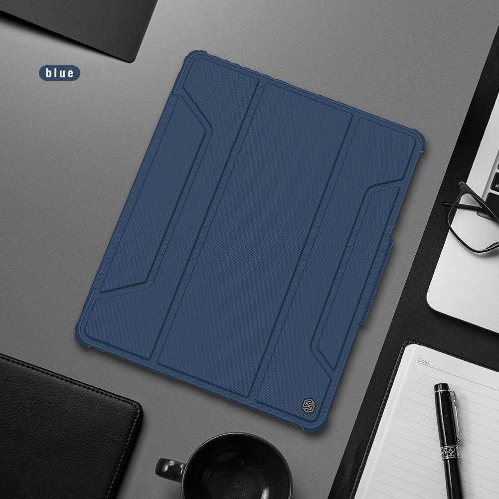 Противоударный чехол книжка синего цвета (Sapphire Blue) с магнитной крышкой и защитной шторкой для задней камеры от Nillkin серии Bumper Pro для планшета iPad Pro 12.9 с 2020 года и iPad Air 13 с 2024 года.