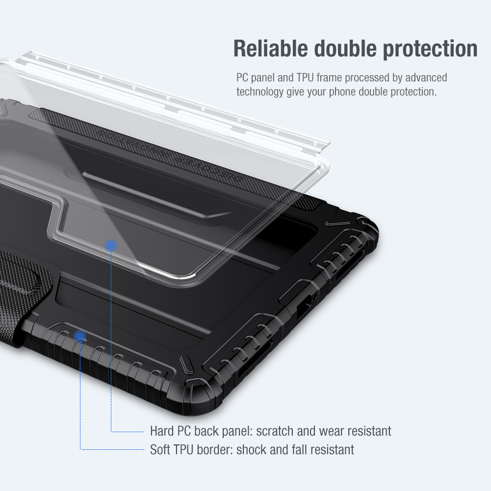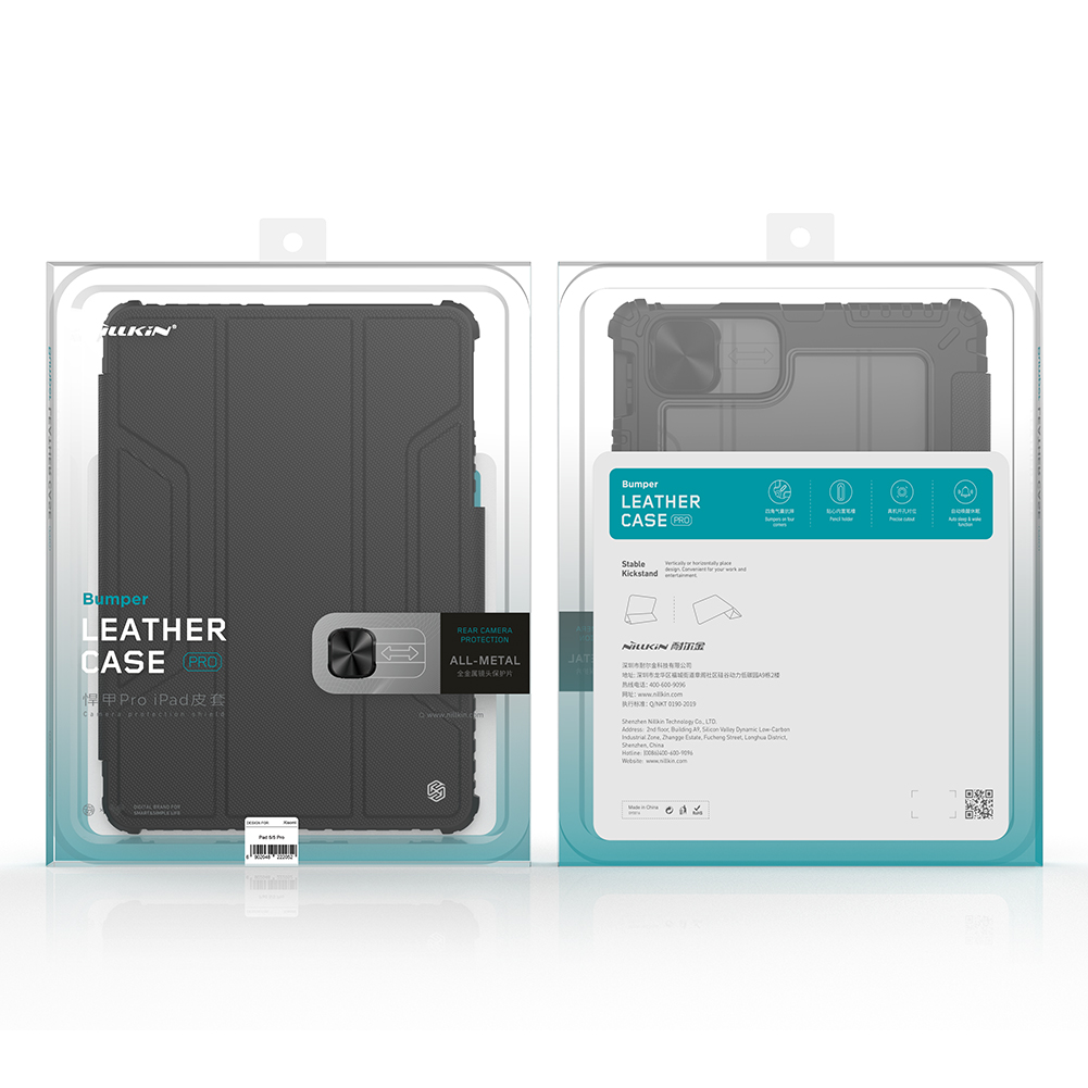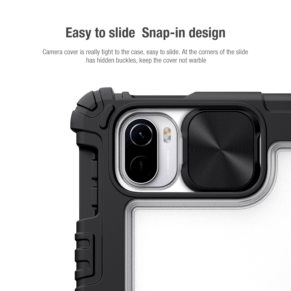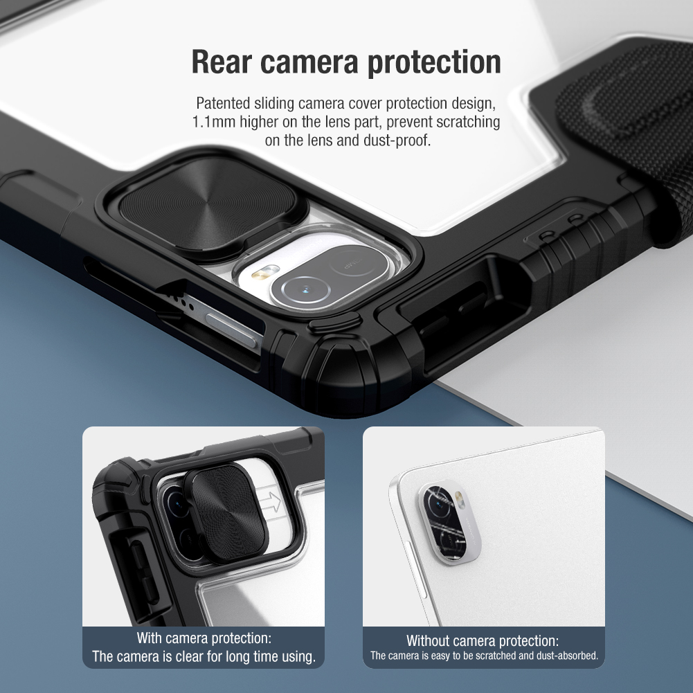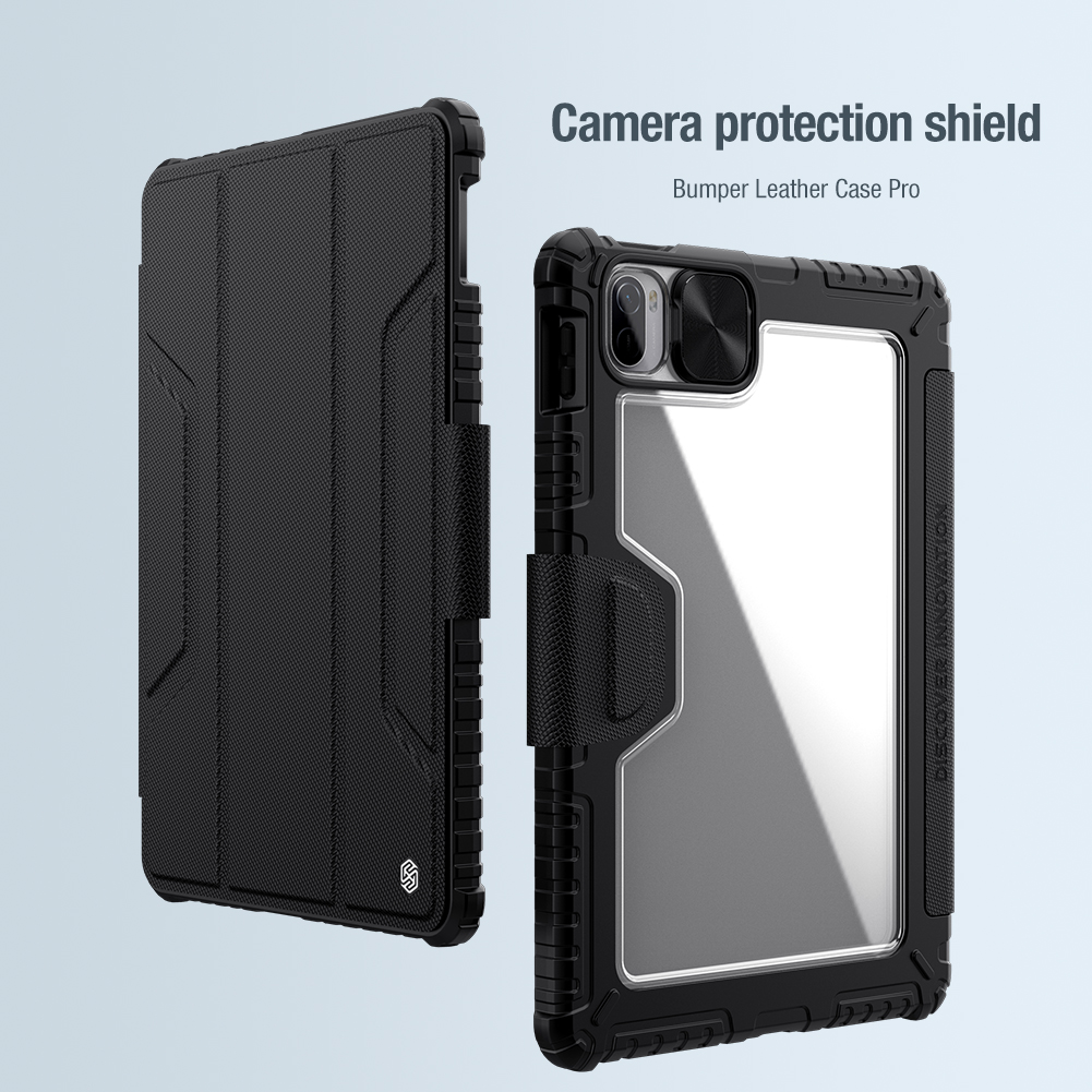 Противоударный чехол книжка черного цвета с магнитной крышкой и защитной шторкой для задней камеры от Nillkin серии Bumper Pro для планшета Xiaomi Pad 5 и Pad 5 Pro.