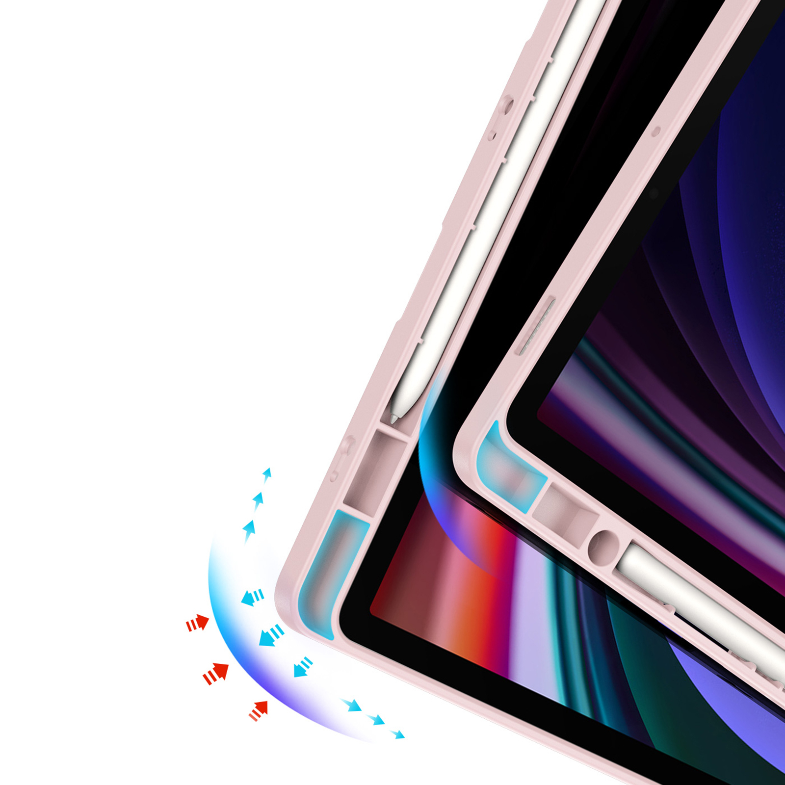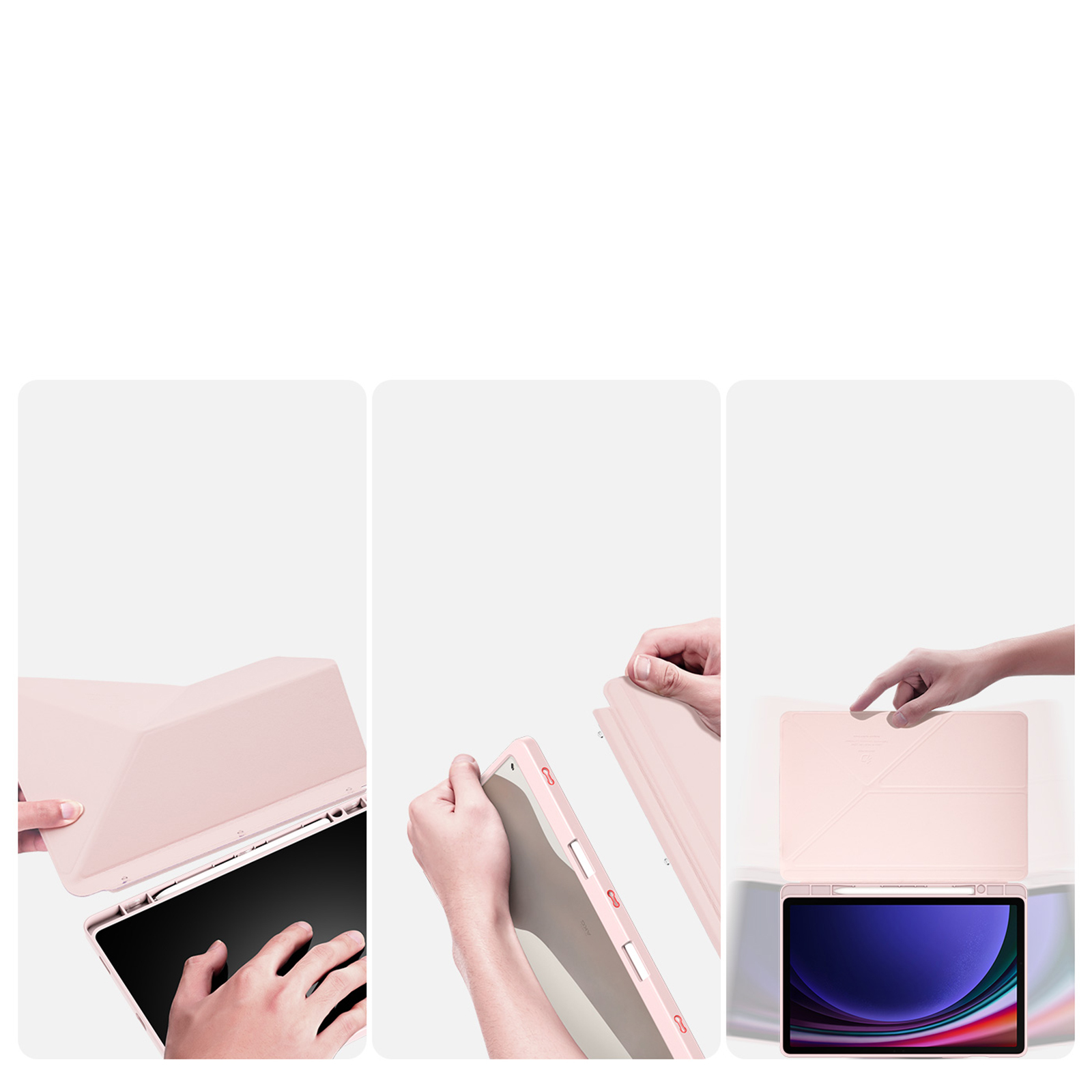 Чехол книжка розового цвета от Dux Ducis для Samsung Galaxy Tab S9, Tab S9 FE и Tab S10 FE, серия Magi Series Case, с держателем Pencil и функцией автоматического перехода в спящий режим. Многофункциональная система складывания.