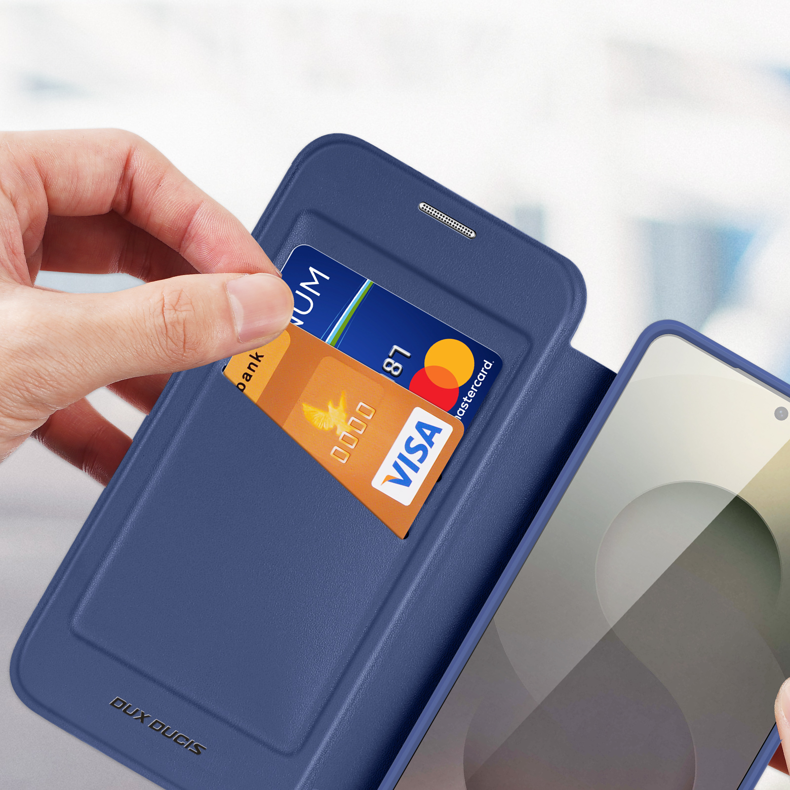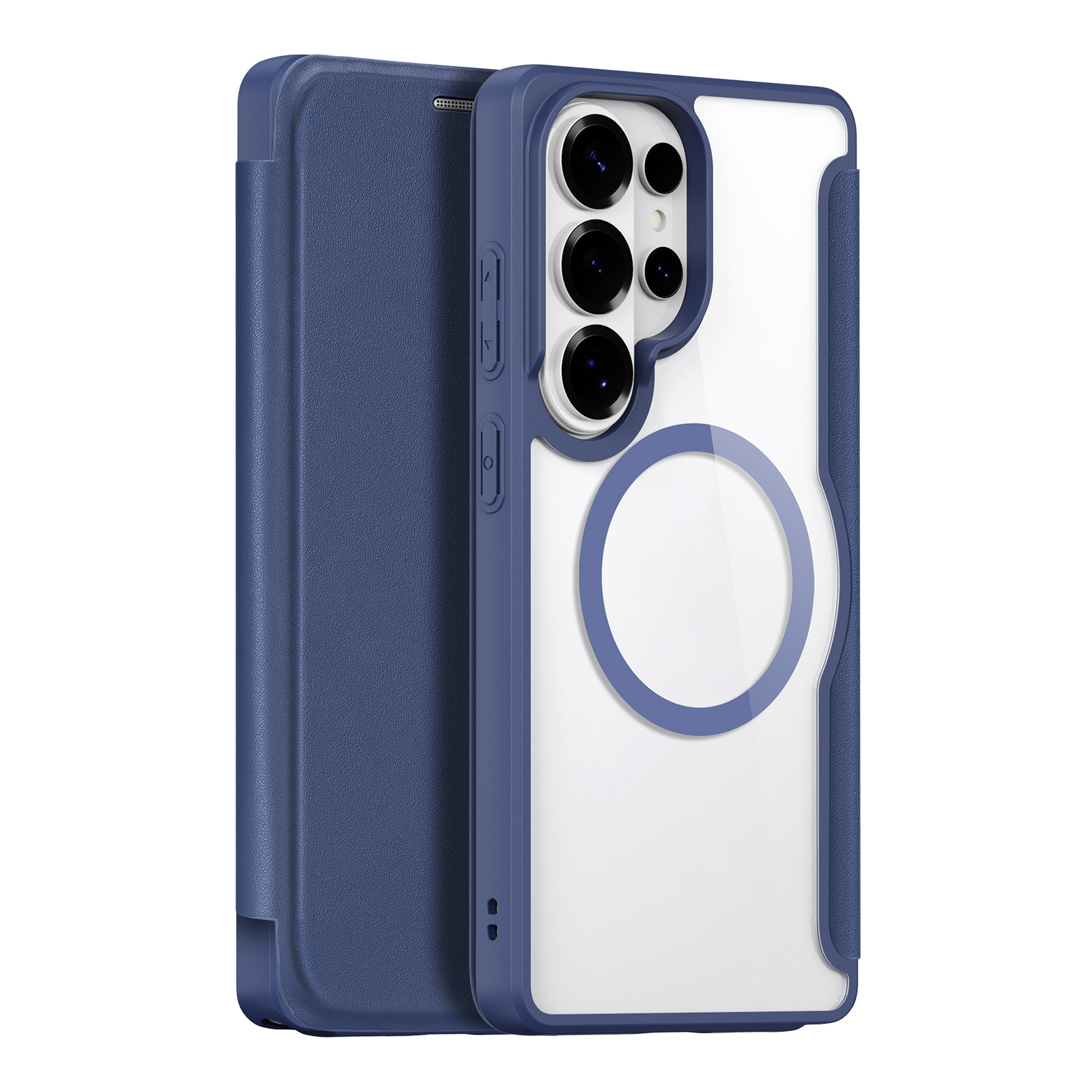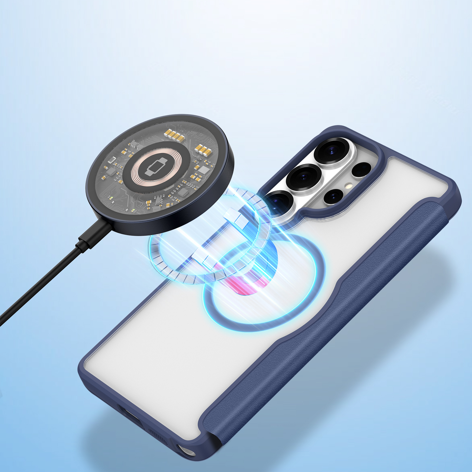 Чехол-книжка синего цвета для Samsung Galaxy S26 Ultra из серии Skin X Pro Series от Dux Ducis — это стильный и функциональный аксессуар, который сочетает в себе защиту и удобство использования. Чехол выполнен в насыщенном голубом оттенке, который выглядит ярко и современно, добавляя смартфону свежести и индивидуальности. Материал чехла обладает мягкой текстурой, приятной на ощупь, и обеспечивает надежную защиту от царапин, ударов и других повреждений. Одной из основных особенностей данного аксессуара является поддержка технологии MagSafe, что позволяет использовать беспроводную зарядку и магнитные аксессуары, не снимая чехол. Это значительно упрощает процесс зарядки и подключения дополнительных устройств. Внутренняя часть чехла оснащена удобными карманами для хранения банковских карт, пропусков или визиток, что делает его не только защитным, но и практичным аксессуаром для повседневного использования. Магнитная защелка обеспечивает надежное закрытие крышки, предотвращая случайное открытие. Чехол разработан с учетом всех особенностей Samsung Galaxy S26 Ultra, обеспечивая полный доступ ко всем кнопкам, камерам и разъемам. Тонкий и легкий дизайн не утяжеляет устройство, сохраняя его мобильность и удобство в использовании. Серия Skin X Pro Series от Dux Ducis предназначена для тех, кто ценит сочетание яркого дизайна, функциональности и современных технологий. Этот чехол станет отличным выбором для владельцев Samsung Galaxy S26 Ultra, желающих подчеркнуть индивидуальность своего устройства и обеспечить ему надежную защиту.