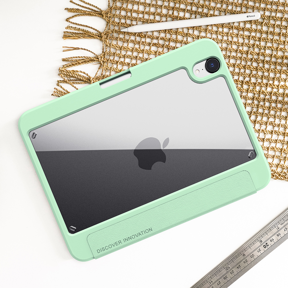 Откидная крышка изготовлена из текстурированной кожи PU, прочной и противоскользящей. Встроенное магнитное соединение поддерживает функцию автоматического пробуждения / сна iPad. Складывающийся угол для защиты линз iPad, складной треугольный кронштейн и держатель карандаша для полной защиты