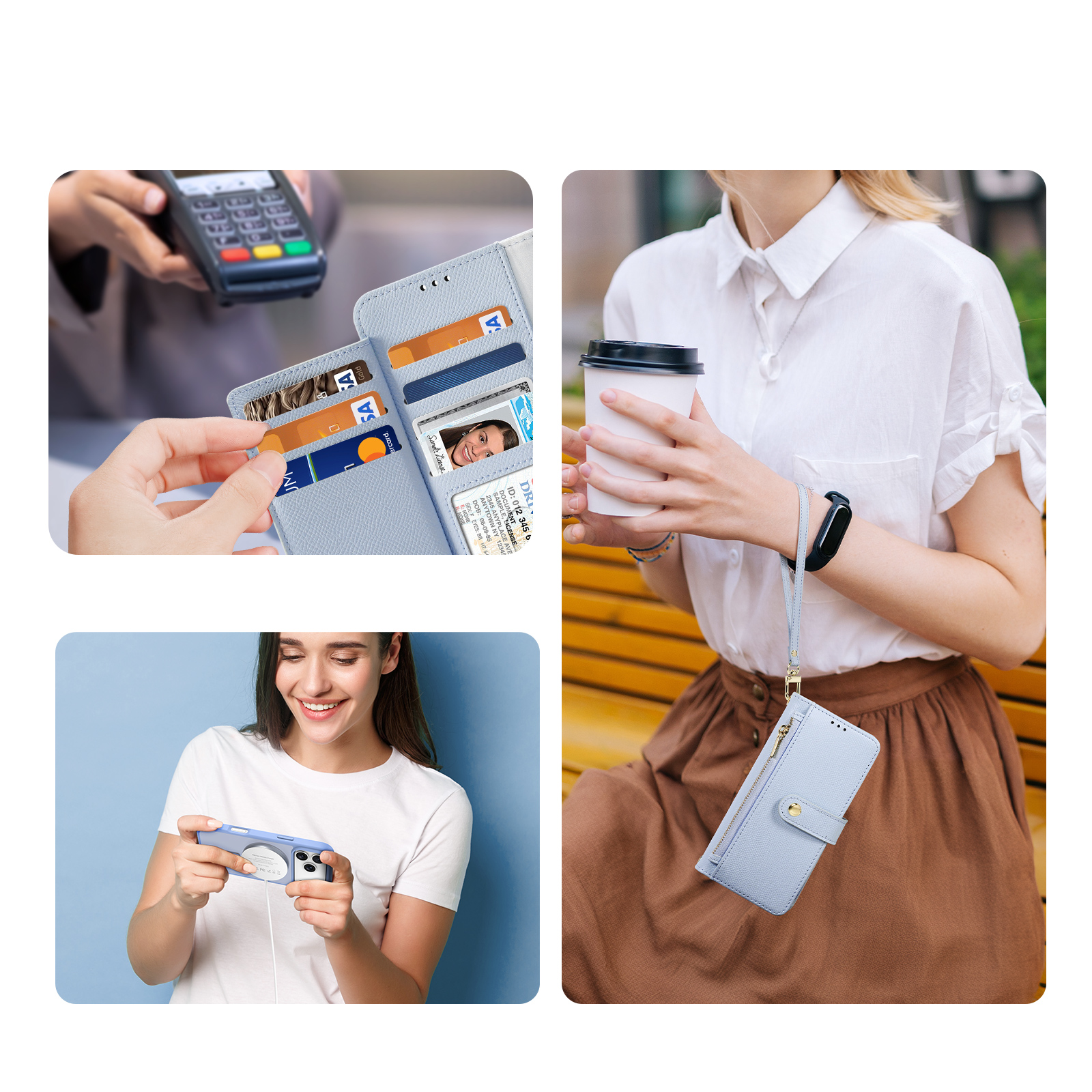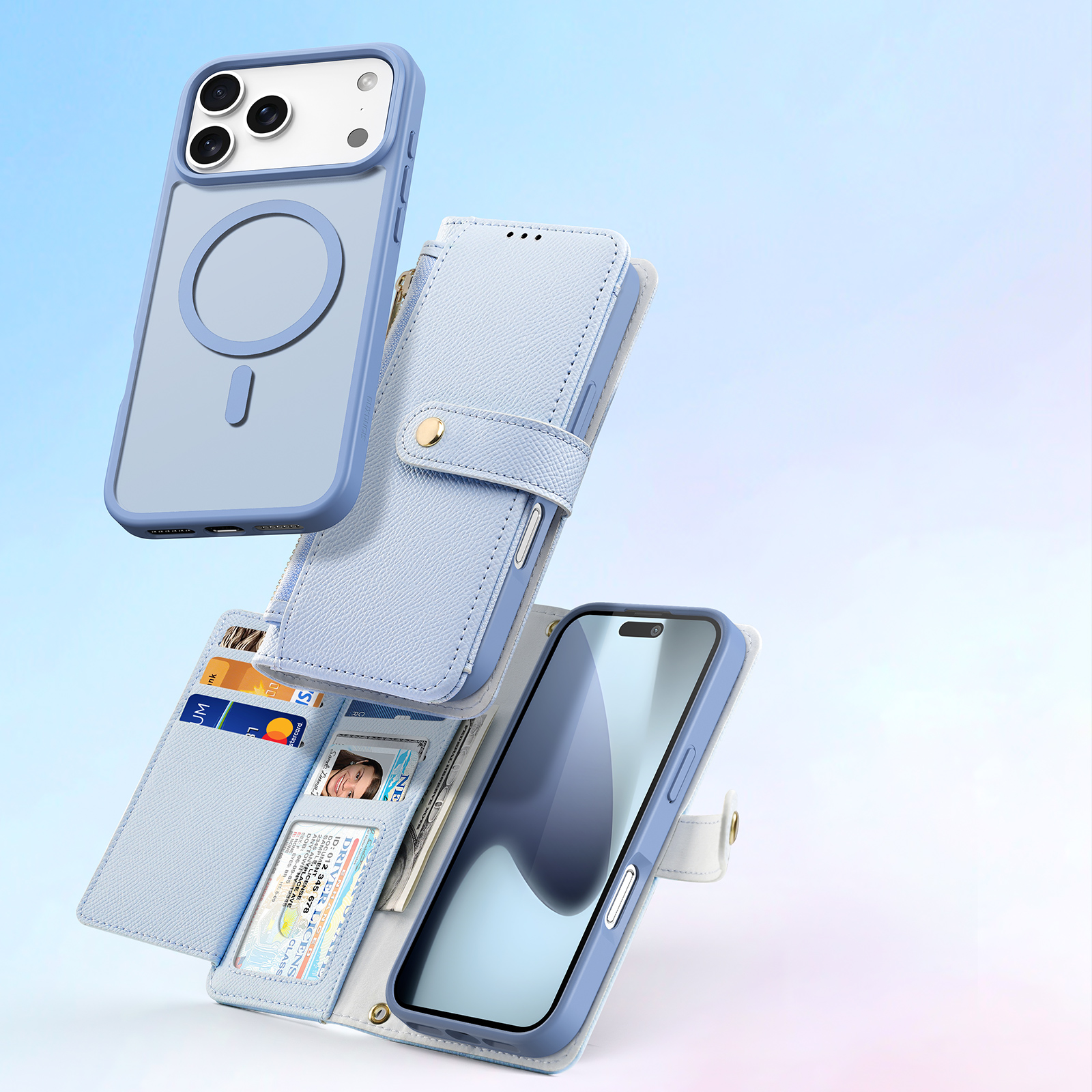 Чехол кошелек от Dux Ducis изготовлен из высококачественной синтетической PU кожи светло-синего цвета (Light Blue) с встроенным чехлом с MagSafe для смартфона iPhone 17 Pro Max, серия Lawa Series Case