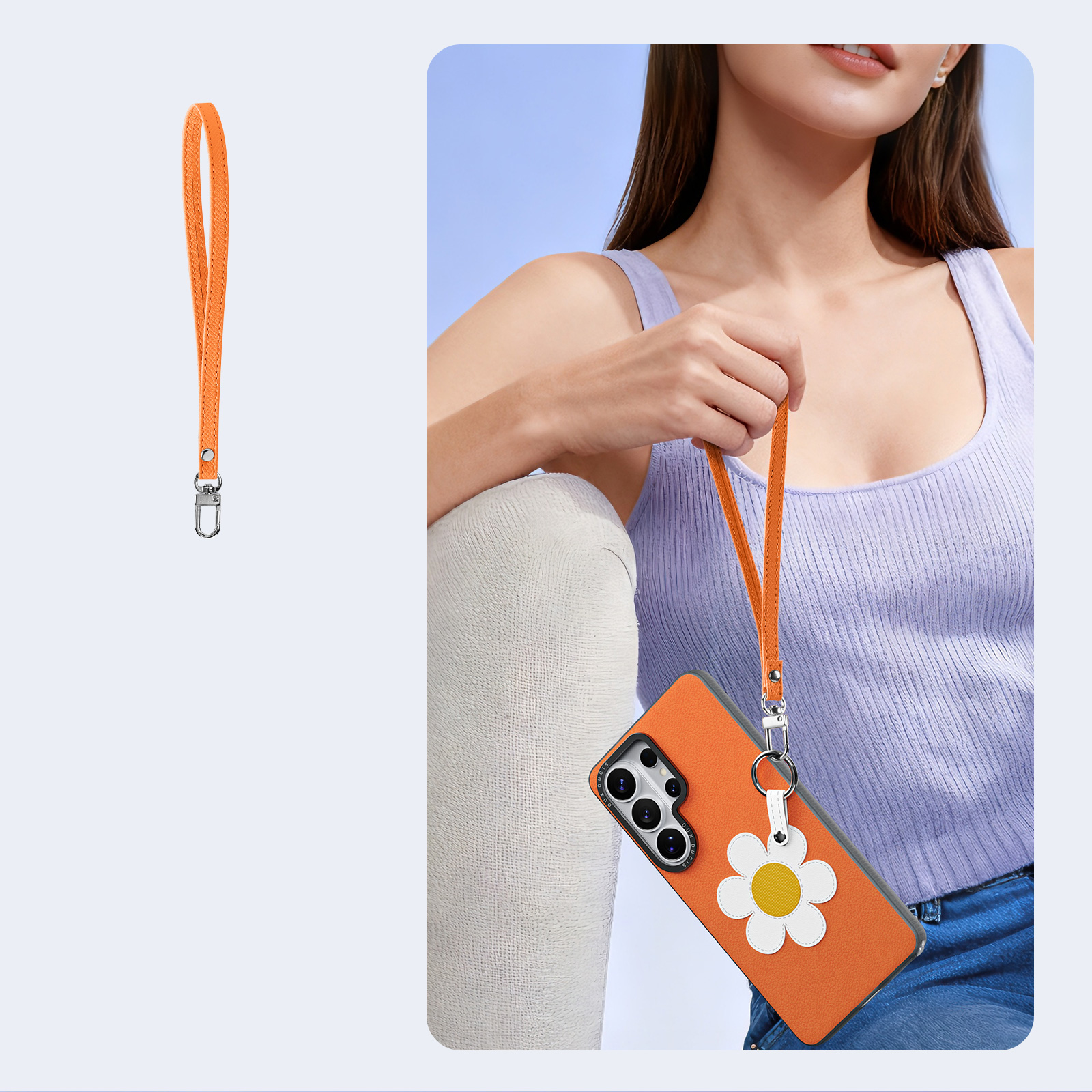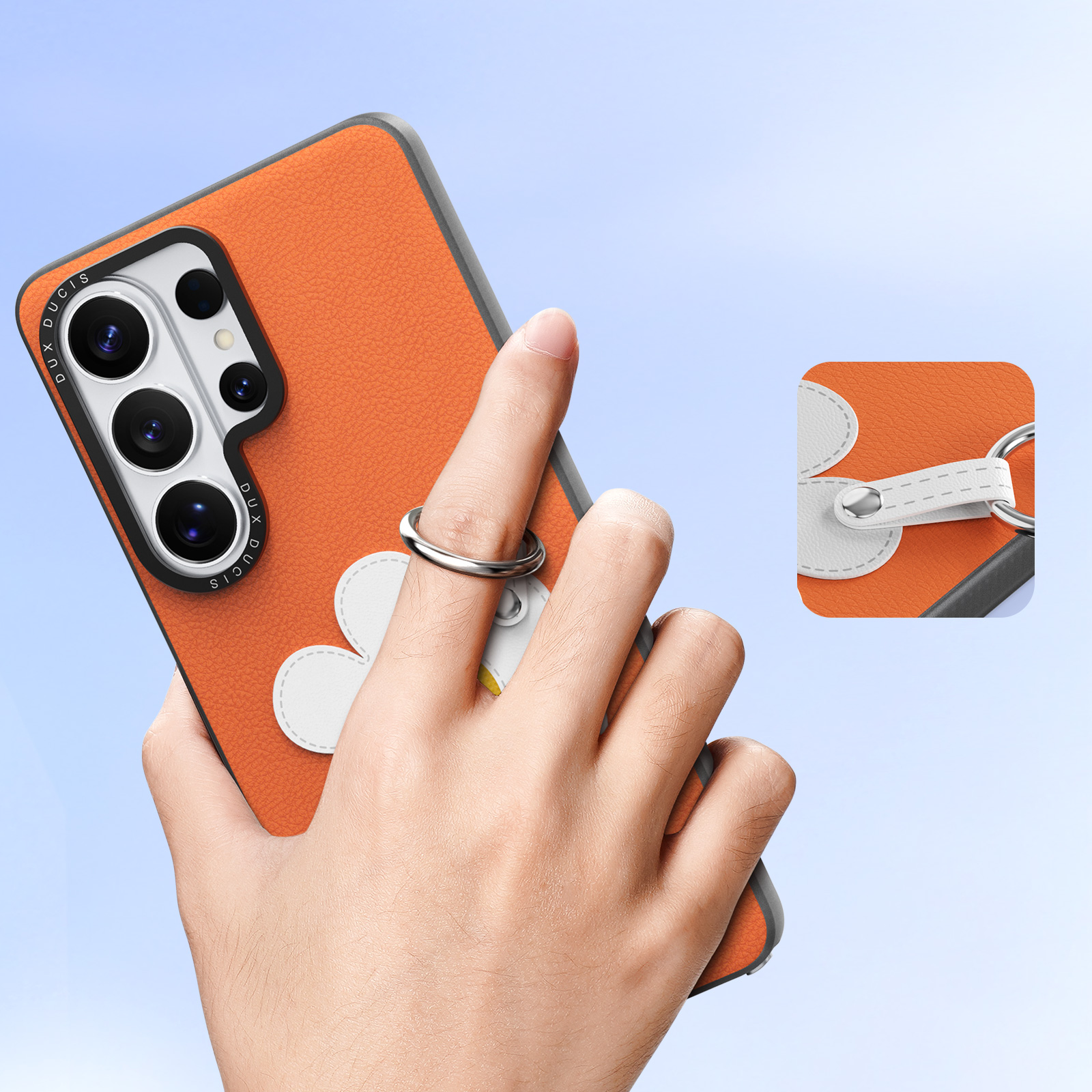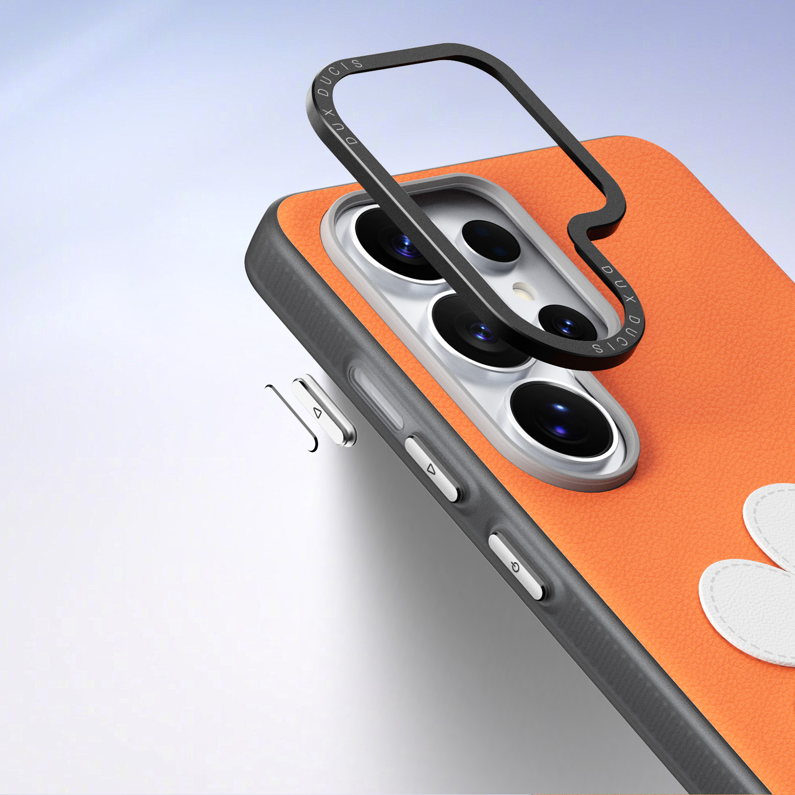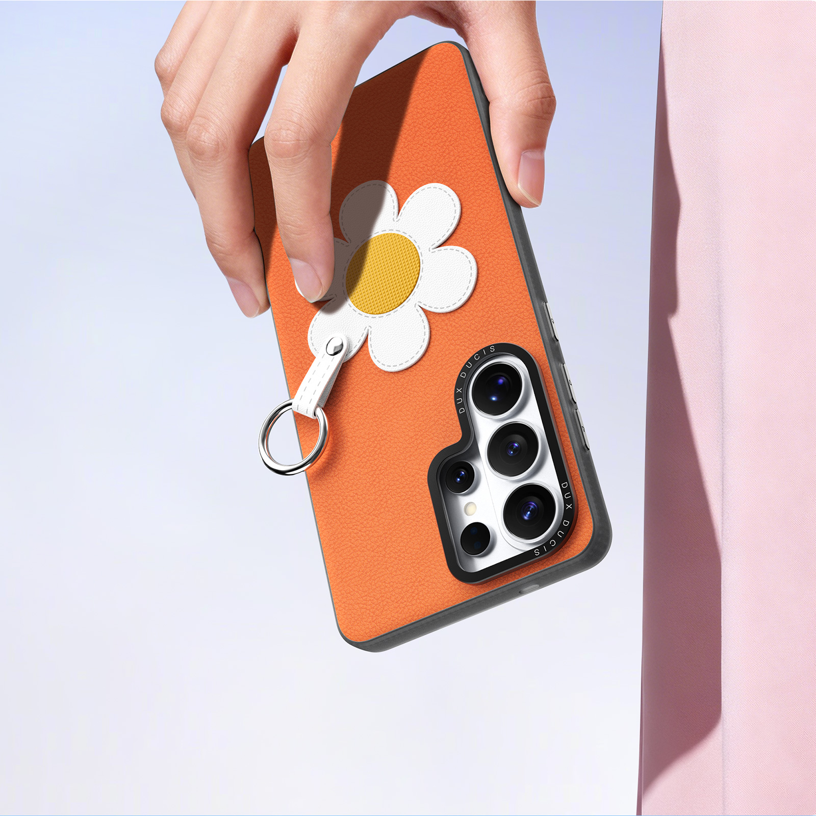 Оранжевый чехол для смартфона Samsung Galaxy S26 Ultra, серия Luvy Series Case от бренда Dux Ducis - это яркий и жизнерадостный аксессуар тёплого кораллового оттенка, поднимающий настроение и притягивающий взгляды. Чехол изготовлен из мягкого, эластичного материала, который плотно прилегает к устройству, обеспечивая эффективную защиту от случайных падений и царапин. Главная особенность дизайна - крупный белый цветок с солнечно-жёлтым центром, расположенный в нижней части чехла, символизирующий радость, энергию и лето. Цветок оборудован удобной металлической застёжкой-кольцом, выполняющей роль съёмного ремешка, который можно надеть на руку или прицепить к сумке для дополнительного комфорта и безопасности. Боковые грани чехла выполнены в тёмно-серых тонах, гармонируя с корпусом телефона и создавая гармоничный визуальный баланс. Чехол оснащён точными прорезями для модулей камеры и всех управляющих элементов, не препятствуя полноценной эксплуатации устройства. Оригинальный и весёлый, этот чехол станет отличным спутником активного и позитивного человека, предпочитающего смелые цвета и креативные решения.