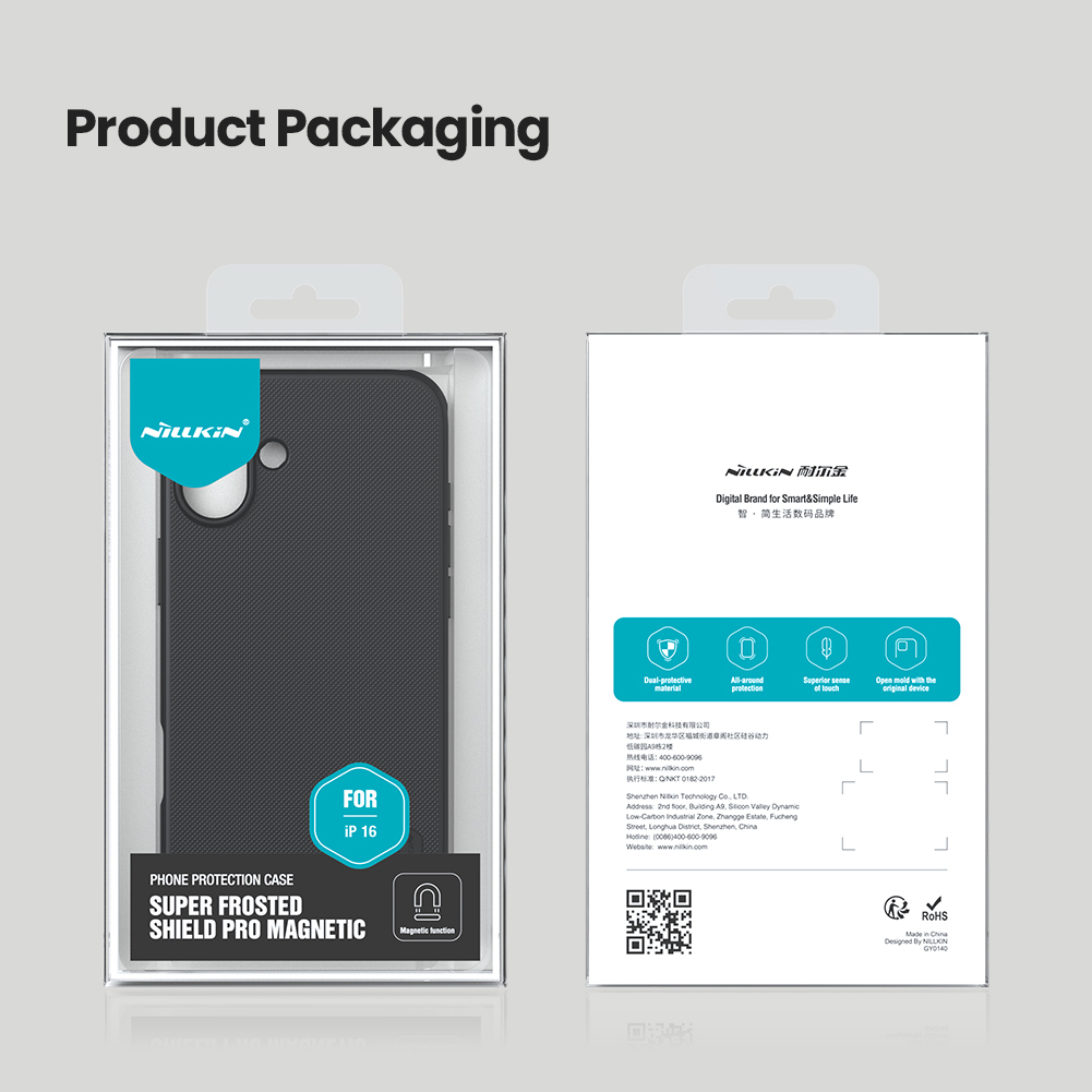Защитный чехол черного цвета от Nillkin серии Super Frosted Shield Pro Magnetic для смартфона iPhone 16 с усиленными боковыми рамками по четырем углам и поддержкой зарядки MagSafe, изготавливается из экологичных материалов PC и TPU путем высокоточного литья под давление с высокой температурой.