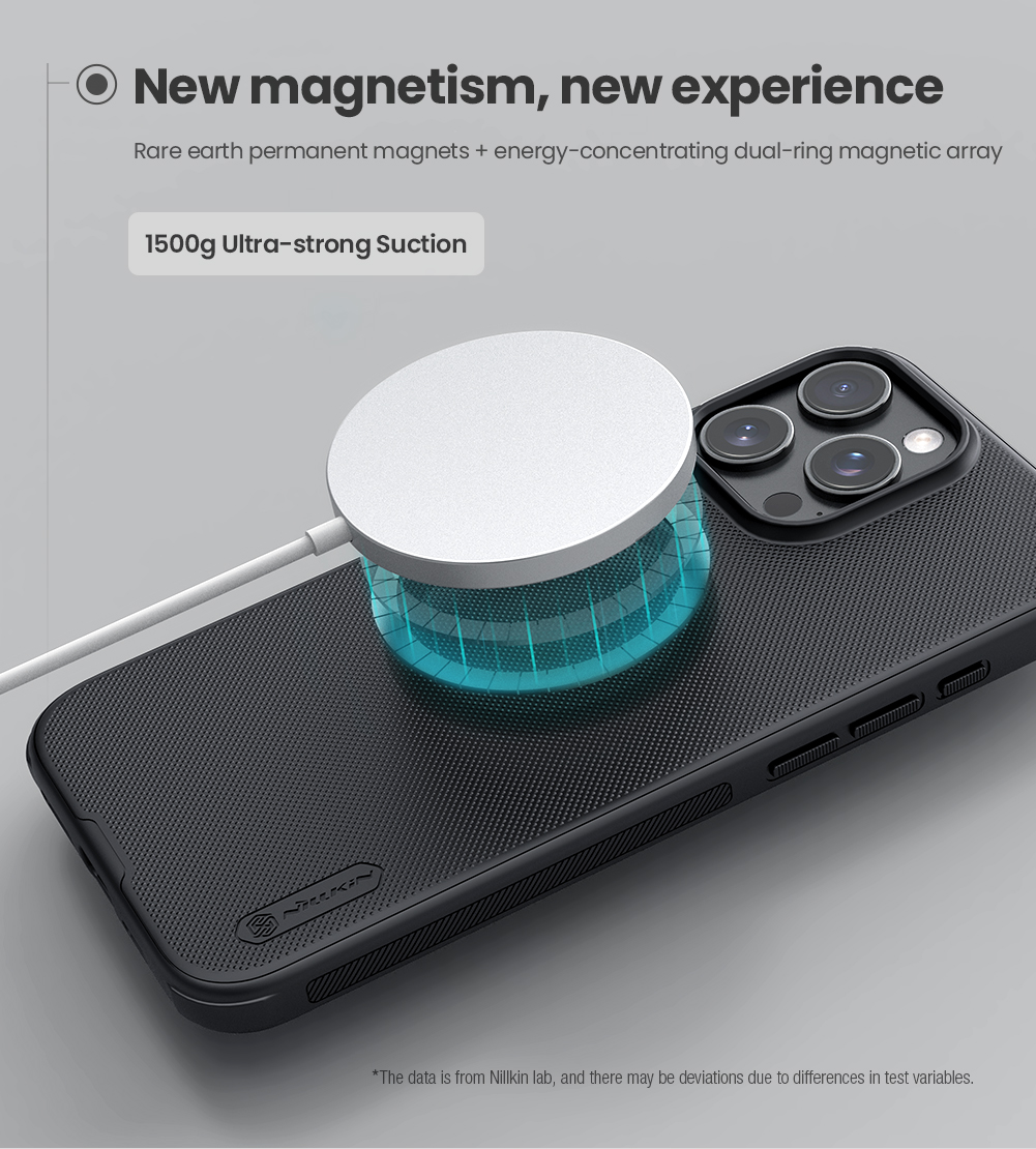Защитный чехол черного цвета от Nillkin серии Super Frosted Shield Pro Magnetic для смартфона iPhone 16 Pro Max с усиленными боковыми рамками по четырем углам и поддержкой зарядки MagSafe, изготавливается из экологичных материалов PC и TPU путем высокоточного литья под давление с высокой температурой.