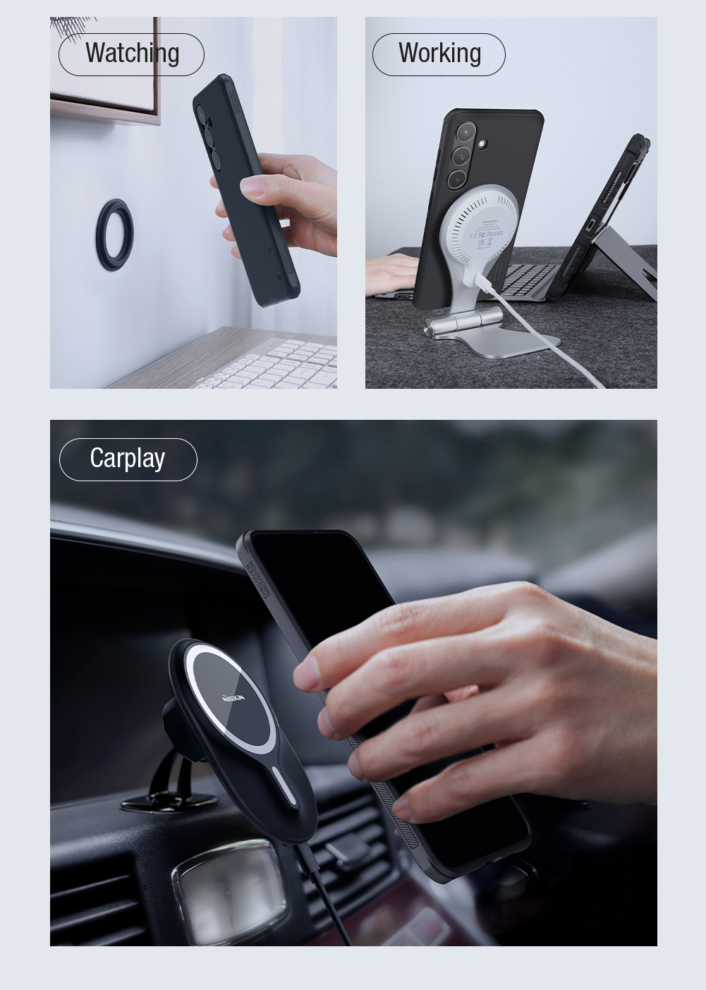 Защитный чехол черного цвета от Nillkin серии Super Frosted Shield Pro Magnetic для смартфона Samsung Galaxy S24 с усиленными боковыми рамками по четырем углам и поддержкой беспроводной зарядки, изготавливается из экологичных материалов PC и TPU путем высокоточного литья под давление с высокой температурой.