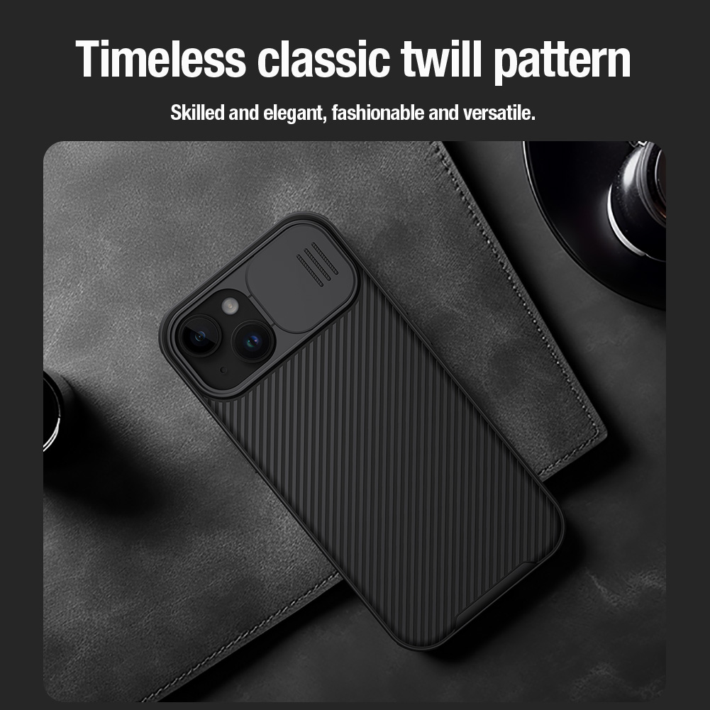 Противоударный чехол черного цвета с защитной крышкой для задней камеры и беспроводной магнитной зарядкой MagSafe от Nillkin серии CamShield Pro Magnetic Case для смартфона iPhone 15.