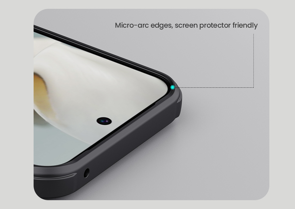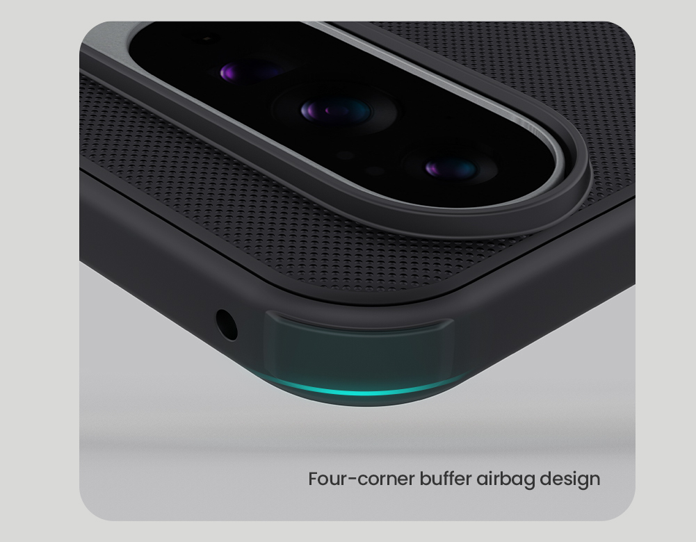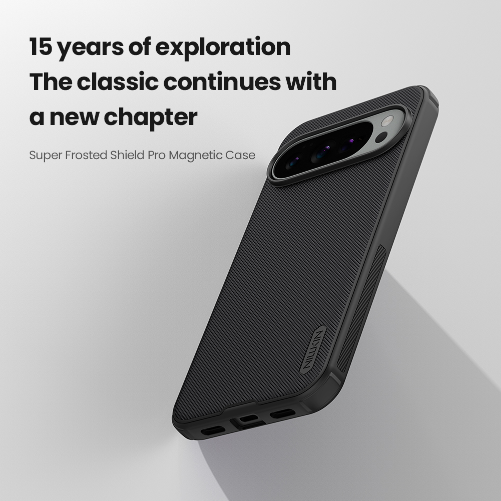 Защитный чехол черного цвета от Nillkin серии Super Frosted Shield Pro Magnetic для смартфона Google Pixel 10 Pro XL с усиленными боковыми рамками по четырем углам и поддержкой зарядки MagSafe, изготавливается из экологичных материалов PC и TPU путем высокоточного литья под давление с высокой температурой.