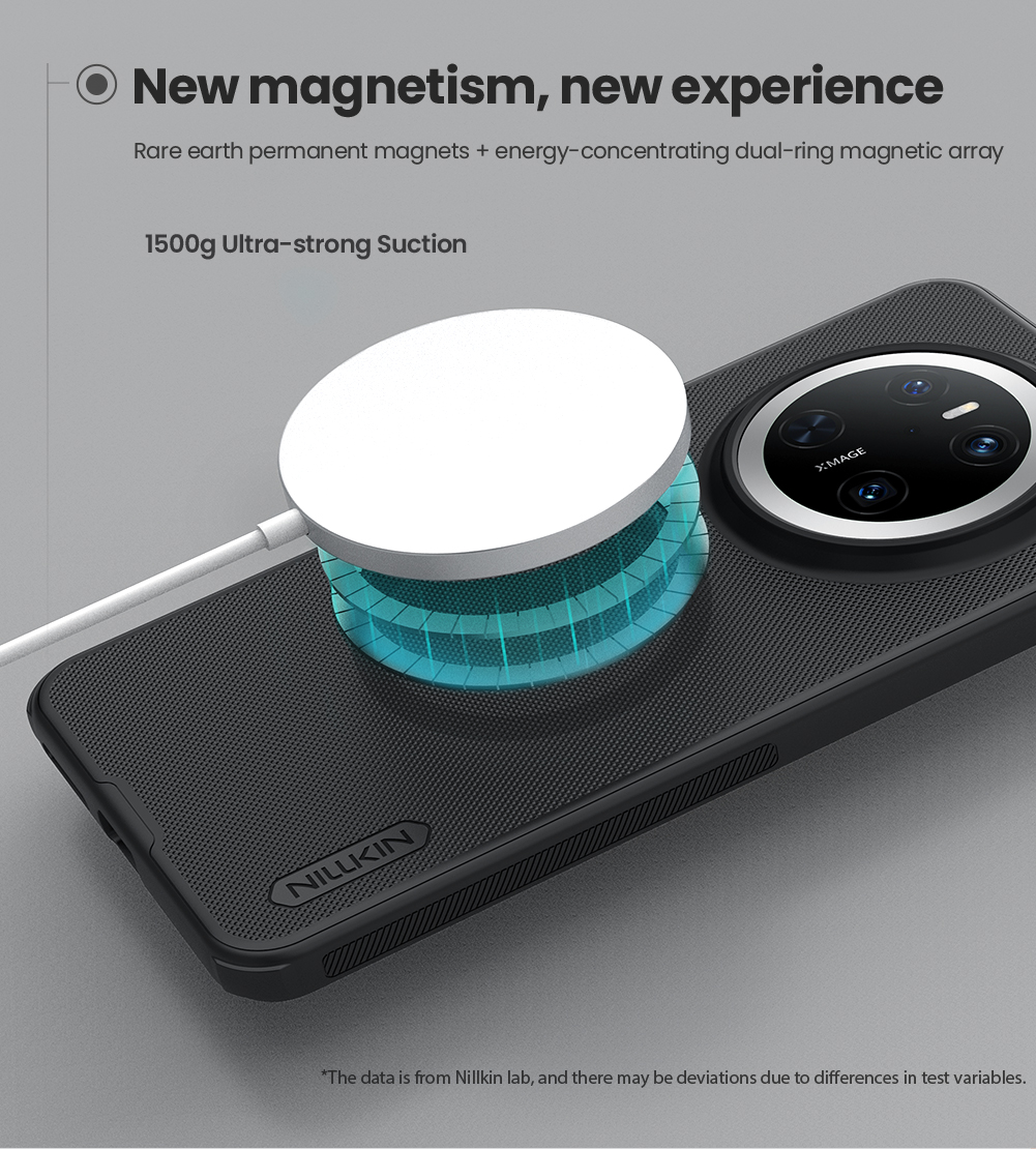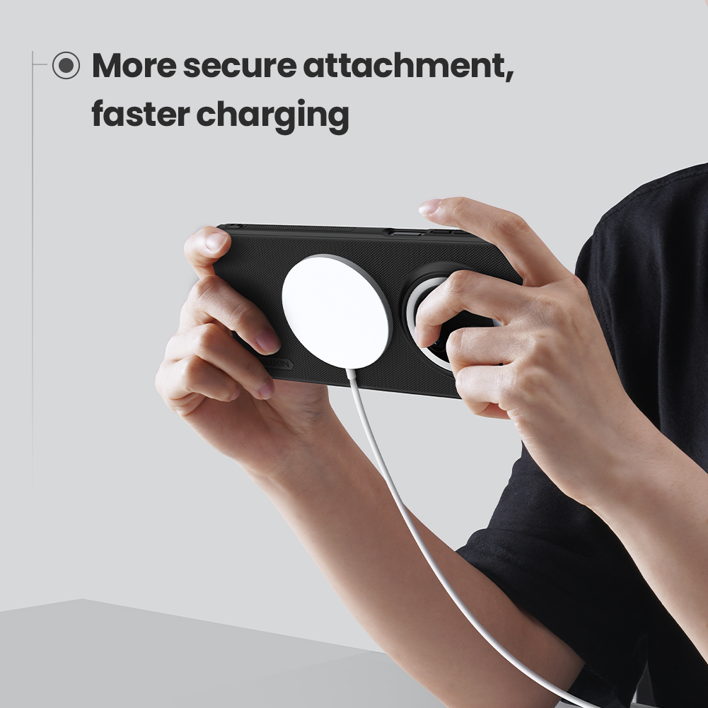 Защитный чехол черного цвета от Nillkin серии Super Frosted Shield Pro Magnetic для смартфона Huawei Mate 70 с усиленными боковыми рамками по четырем углам и поддержкой зарядки MagSafe, изготавливается из экологичных материалов PC и TPU путем высокоточного литья под давление с высокой температурой.