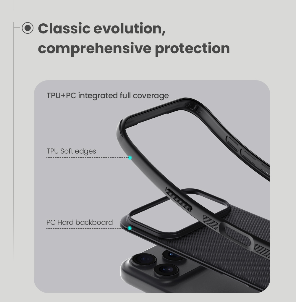 Защитный чехол черного цвета от Nillkin серии Super Frosted Shield Pro Magnetic для смартфона iPhone 17 Pro с усиленными боковыми рамками по четырем углам и поддержкой зарядки MagSafe, изготавливается из экологичных материалов PC и TPU путем высокоточного литья под давление с высокой температурой.