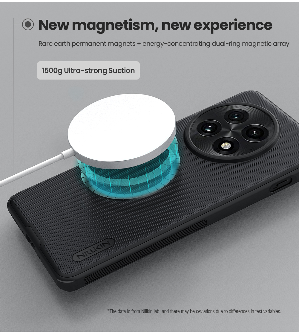 Защитный чехол черного цвета от Nillkin серии Super Frosted Shield Pro Magnetic для смартфона OnePlus 13 с усиленными боковыми рамками по четырем углам и поддержкой зарядки MagSafe, изготавливается из экологичных материалов PC и TPU путем высокоточного литья под давление с высокой температурой.