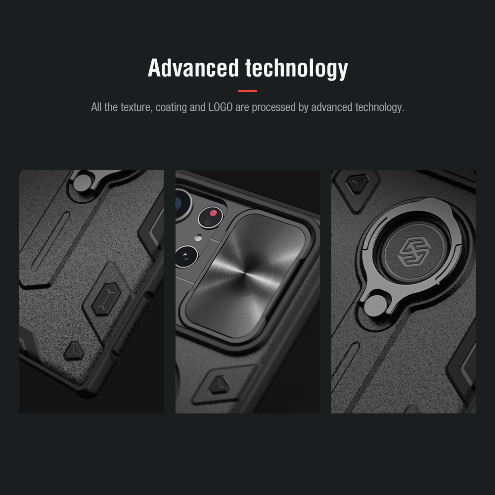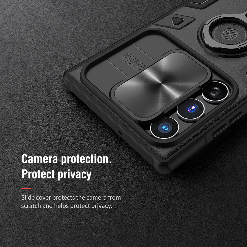 Противоударный чехол с кольцом и металлической защитной крышкой для задней камеры от Nillkin серии CamShield Armor Case для телефона Samsung Galaxy S22 Ultra создан для любителей активного отдыха.