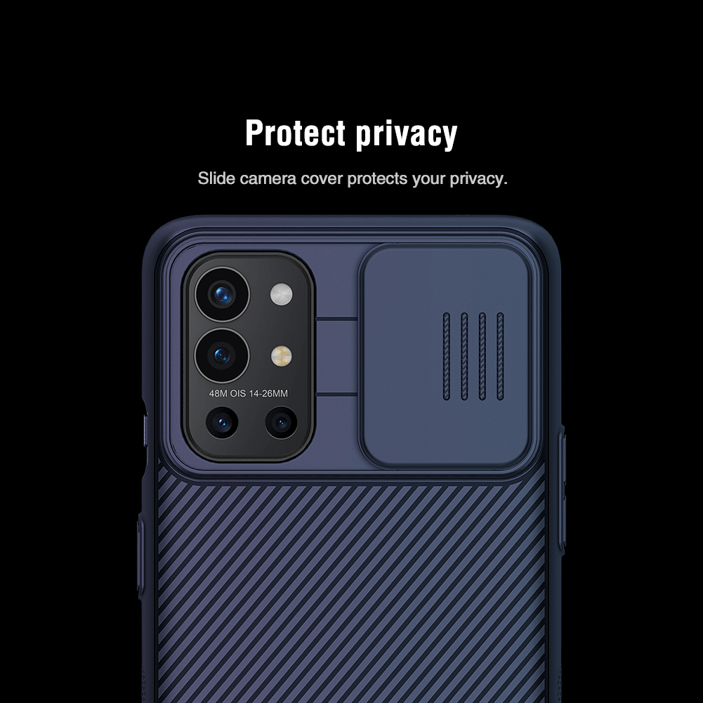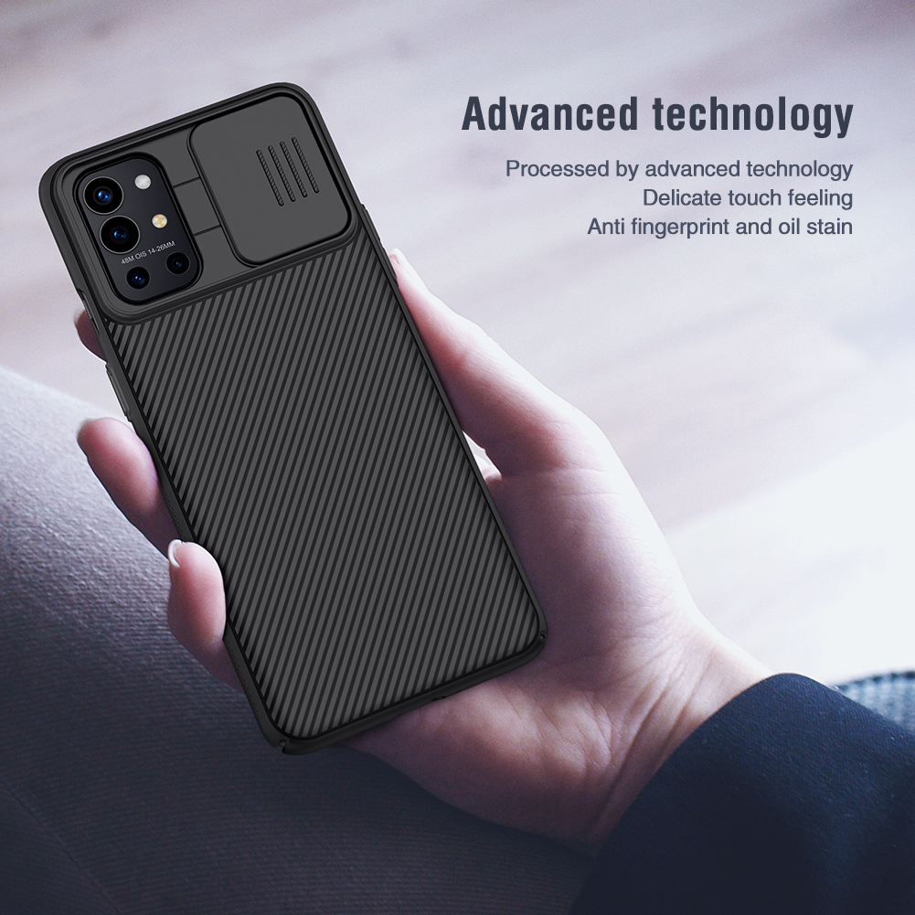 Противоударный чехол черного цвета с защитной крышкой задней камеры серии CamShield Case от Nillkin для телефона OnePlus 9R с 2021 года, создан для любителей активного отдыха.