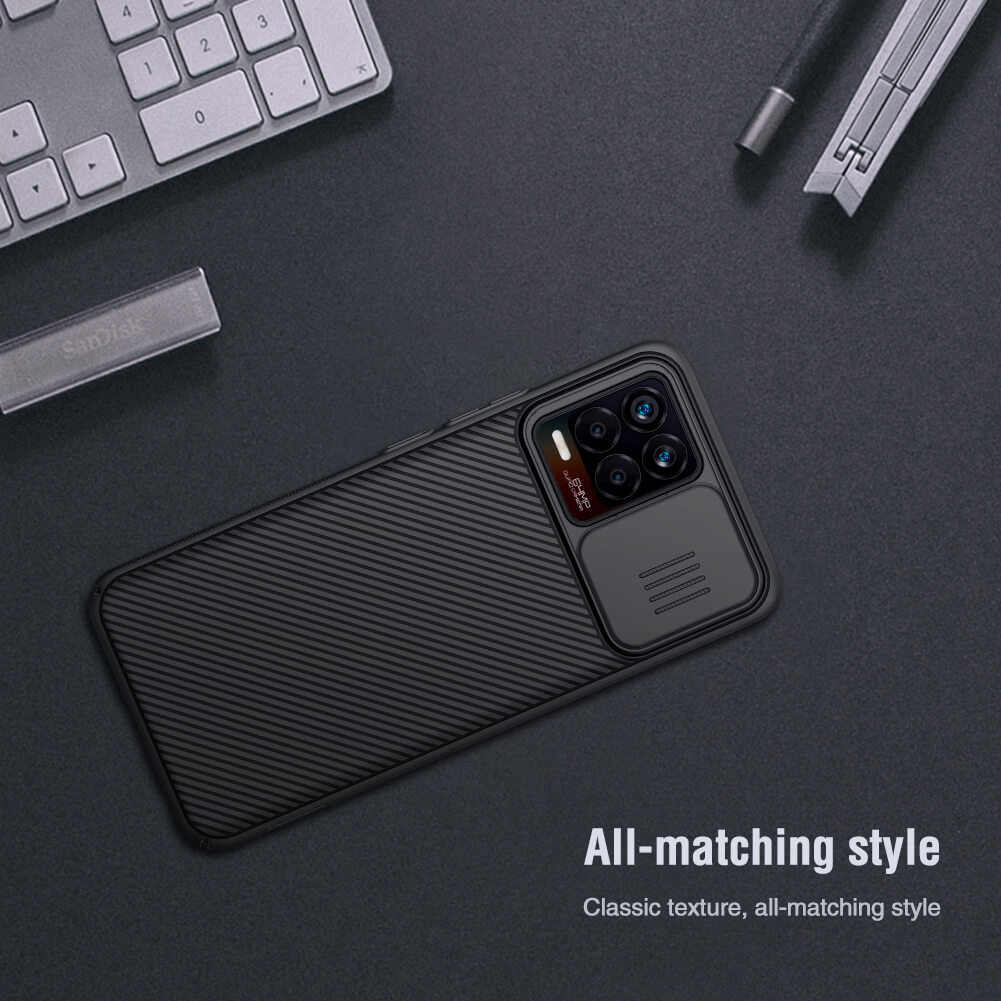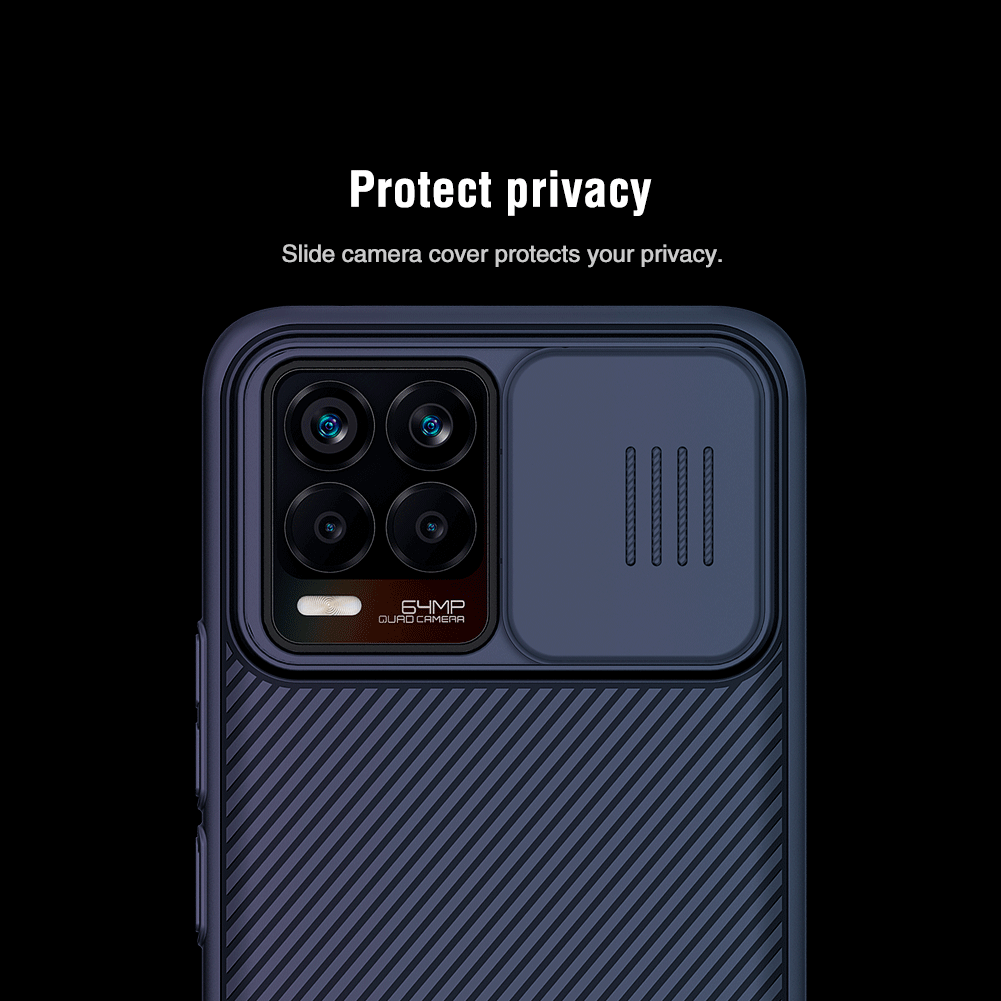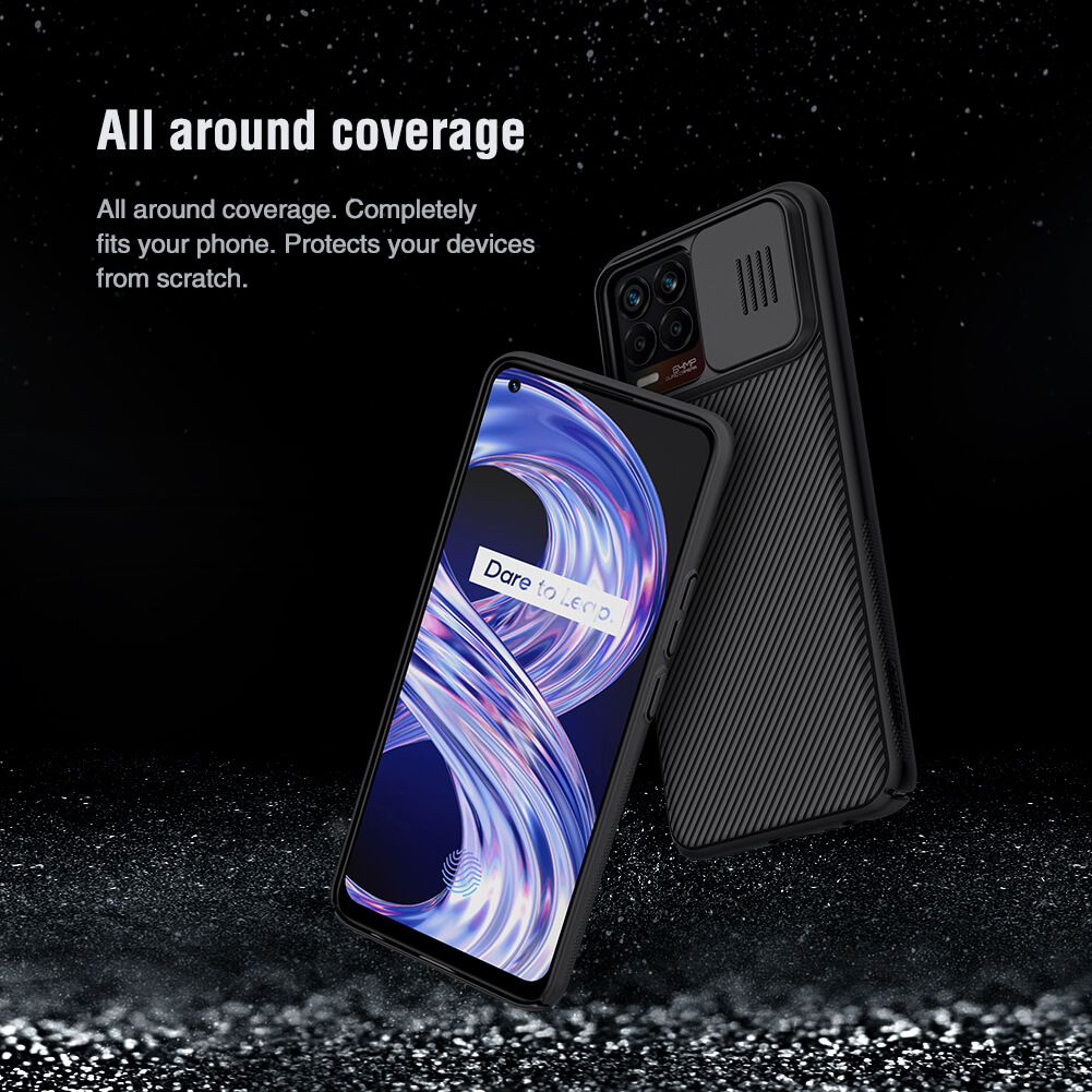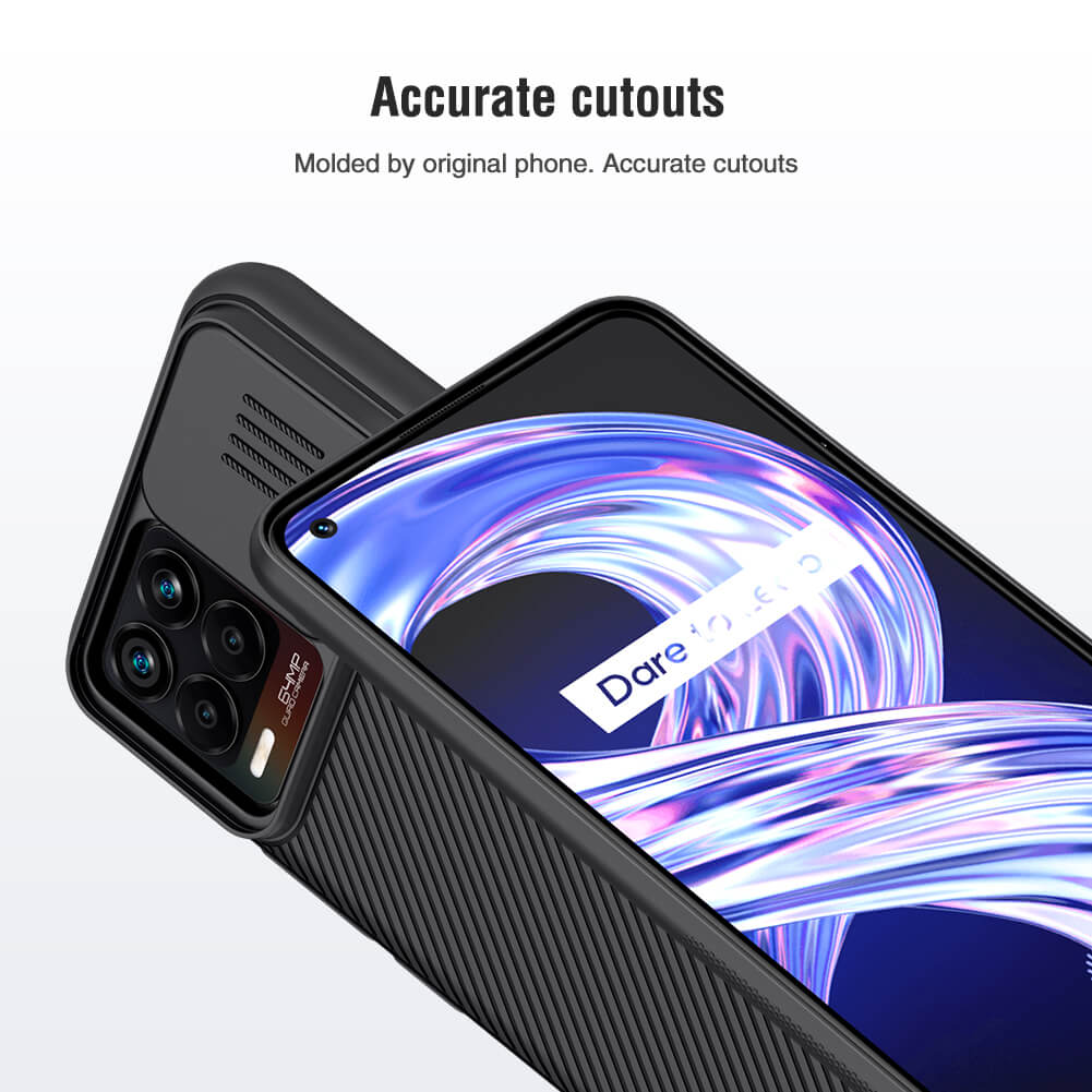 Противоударный чехол черного цвета с защитной крышкой задней камеры серии CamShield Case от Nillkin для OPPO Realme 8 и 8 Pro создан для любителей активного отдыха.