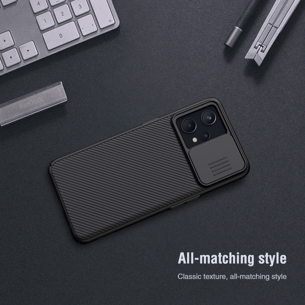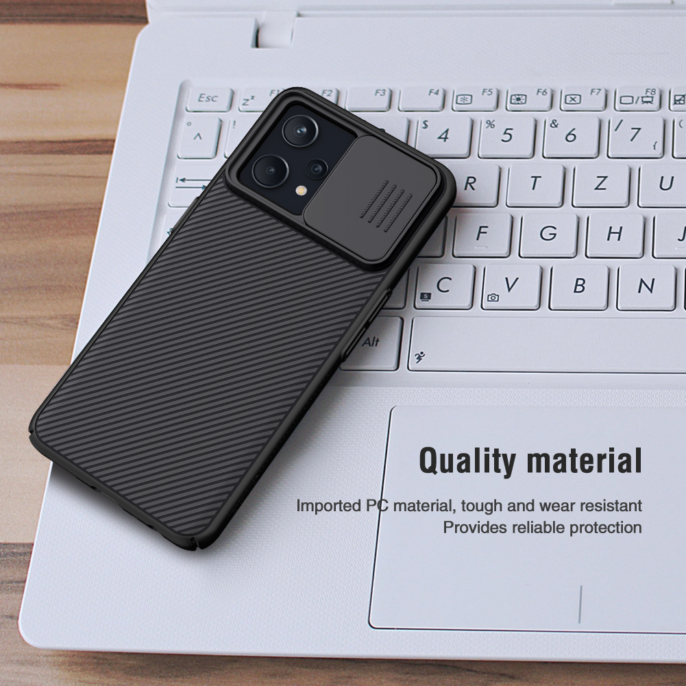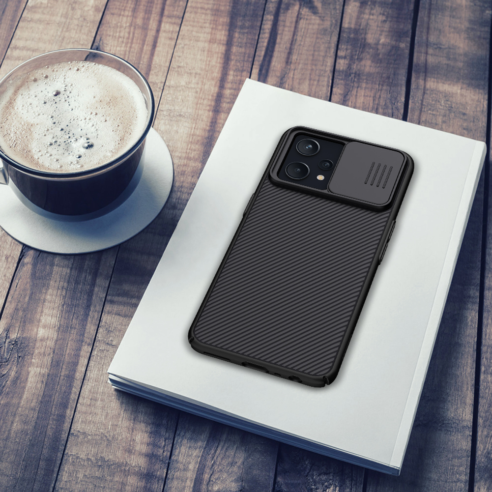 Противоударный чехол черного цвета с защитной крышкой задней камеры серии CamShield Case от Nillkin для смартфона Realme 9 4G и 9 PRO+ 5G создан для любителей активного отдыха.