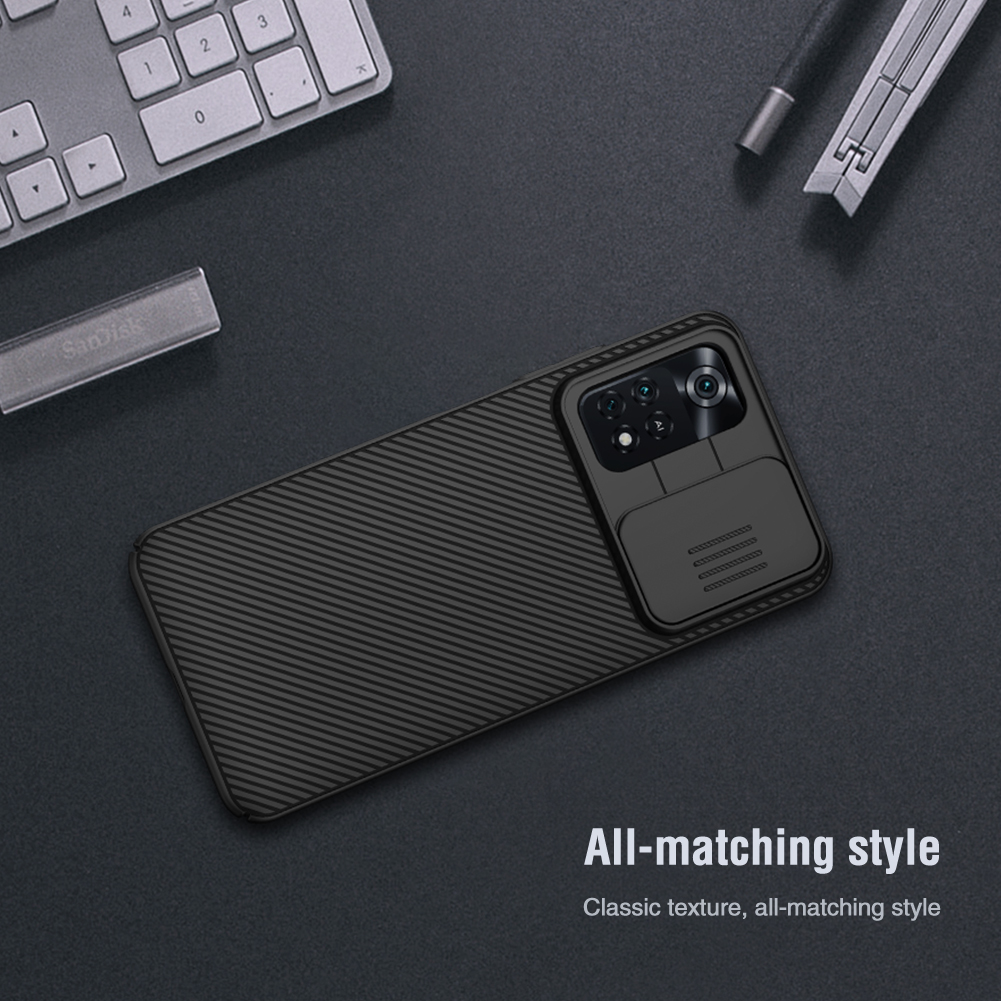 Противоударный чехол черного цвета с защитной крышкой задней камеры серии CamShield Case от Nillkin для телефона Xiaomi Poco M4 Pro 4G, создан для любителей активного отдыха.