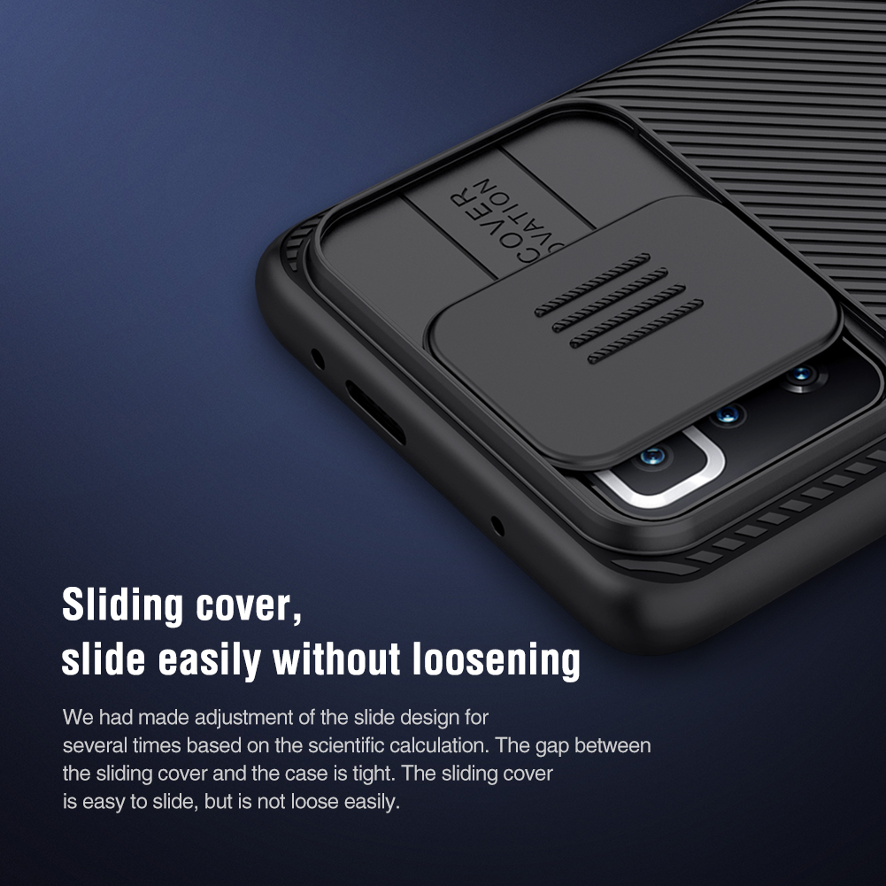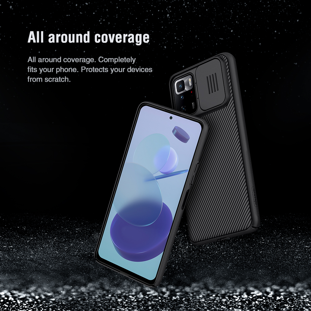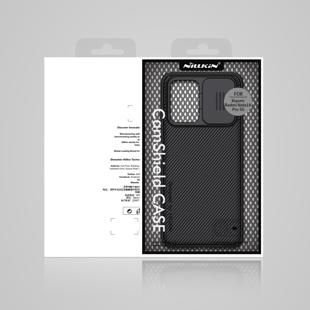 Противоударный чехол черного цвета с защитной крышкой задней камеры серии CamShield Case от Nillkin для телефона Xiaomi Poco X3 GT и Redmi Note 10 Pro 5G, создан для любителей активного отдыха.