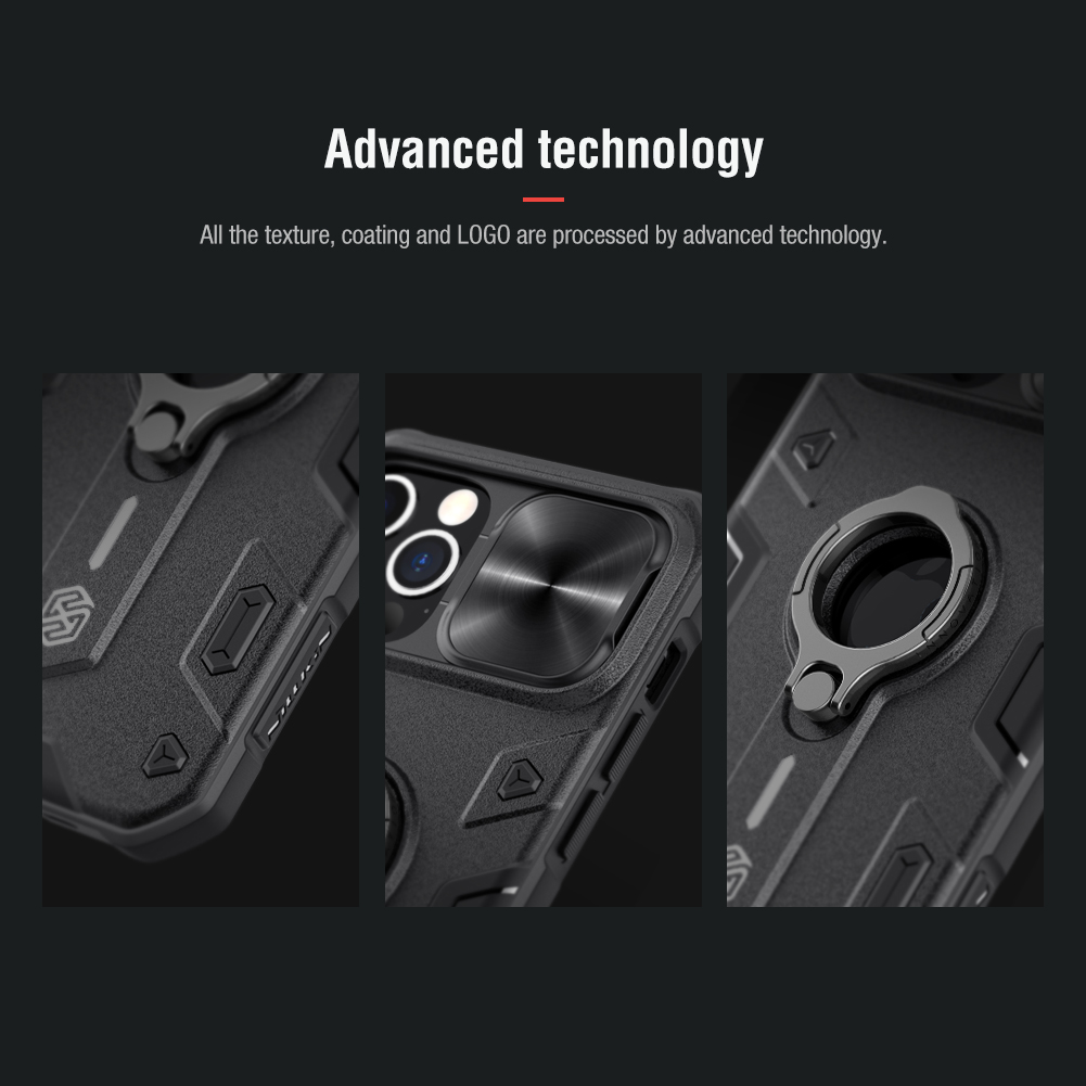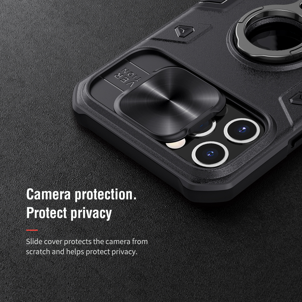 Противоударный чехол с кольцом и металлической защитной крышкой для задней камеры (модель с отверстием под логотип) от Nillkin серии CamShield Armor Case для iPhone 12 и 12 pro создан для любителей активного отдыха.