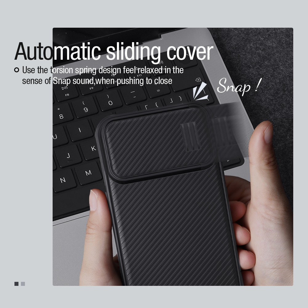 Противоударный чехол черного цвета с полуавтоматической защитной шторкой для задней камеры от Nillkin серии CamShield S Case для телефона iPhone 14 Pro Max создан для любителей активного отдыха.