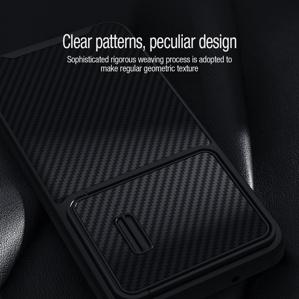 Противоударный чехол покрытый синтетическим волокном с полуавтоматической защитной шторкой задней камеры от Nillkin серии Synthetic Fiber S для телефона Samsung Galaxy S23 создан для любителей активного отдыха.