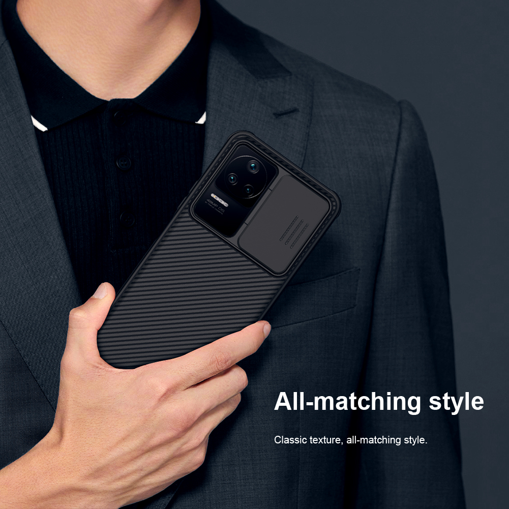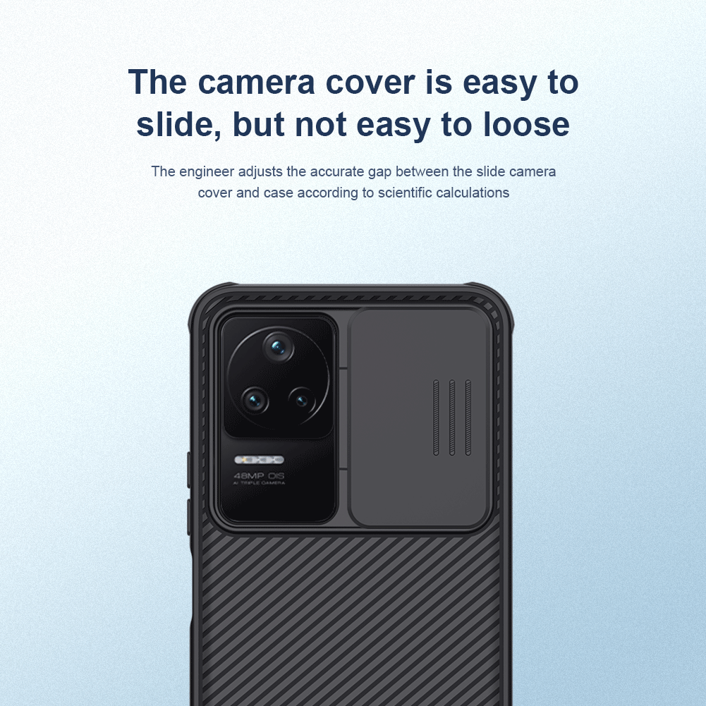 Противоударный чехол черного цвета с защитной шторкой задней камеры от Nillkin серии CamShield Pro Case для телефона Xiaomi Poco F4 5G (Redmi K40S) создан для любителей активного отдыха.