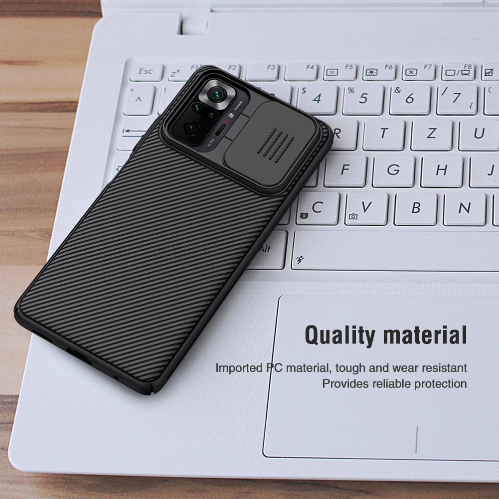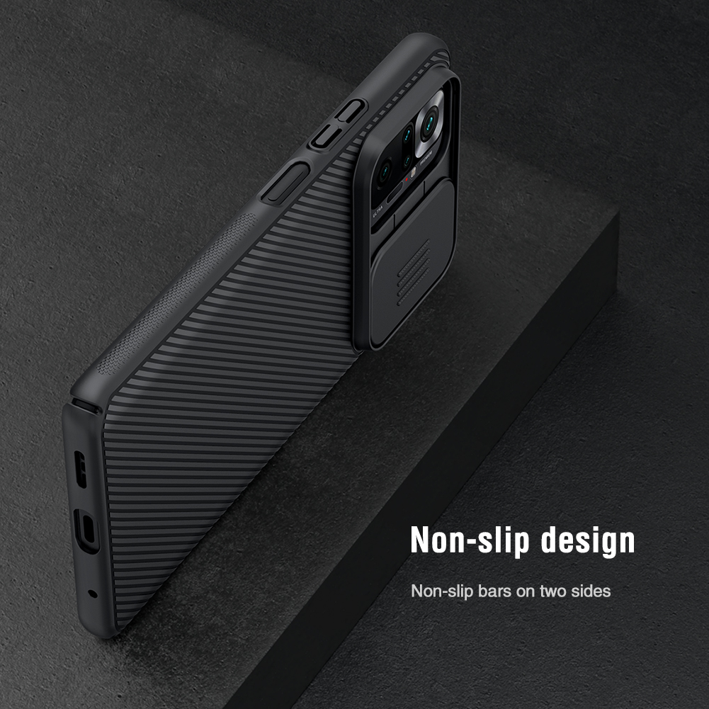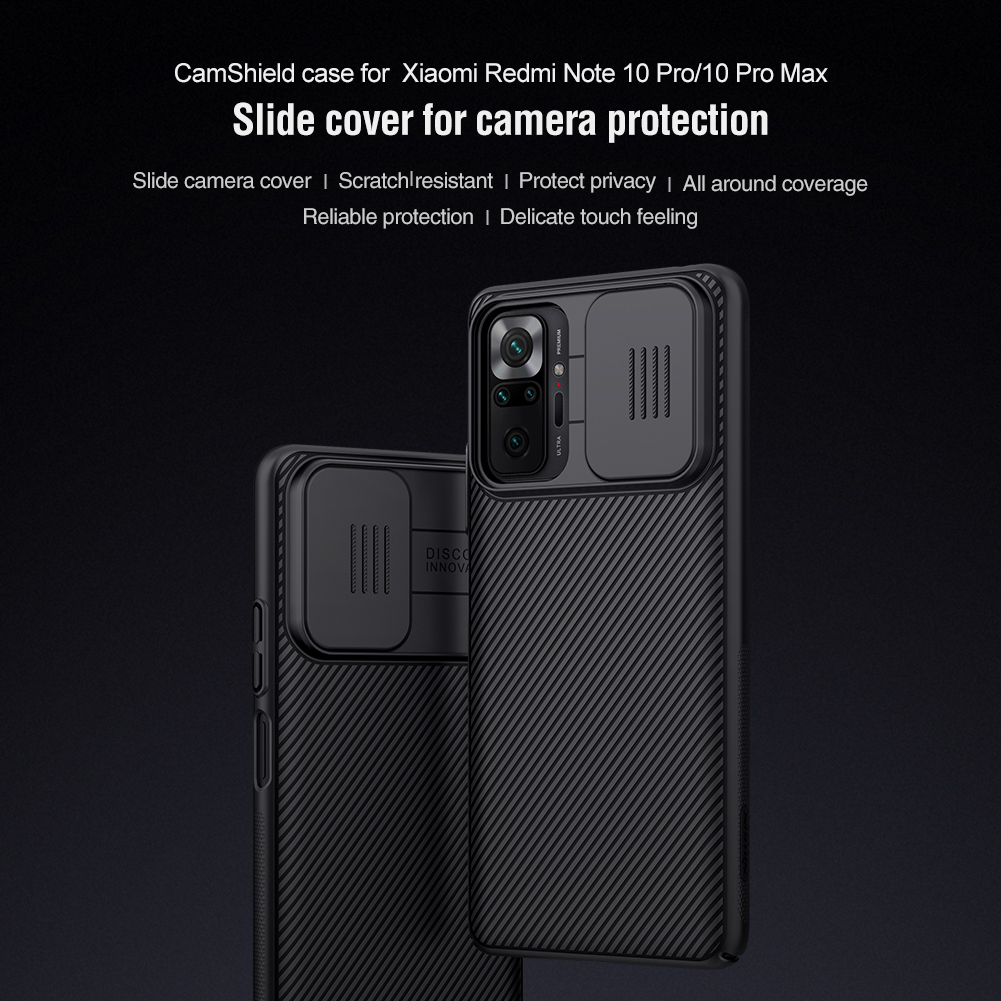 Противоударный чехол черного цвета с защитной крышкой задней камеры серии CamShield Case от Nillkin для Xiaomi Redmi Note 10 Pro и 10 Pro Max создан для любителей активного отдыха.